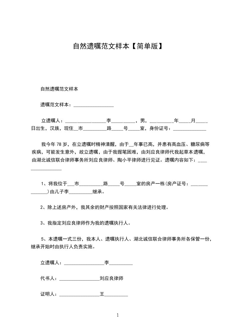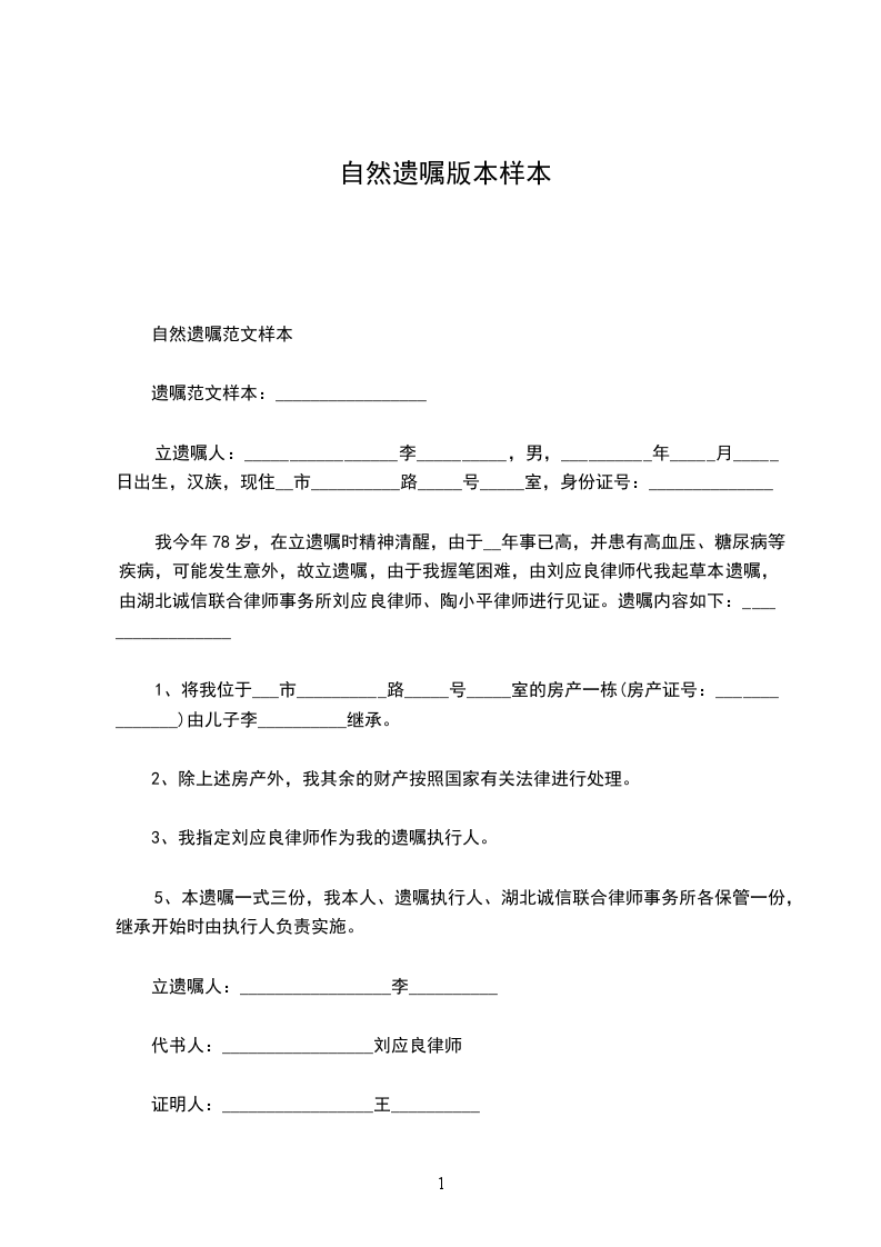 自然遗嘱范文样本
