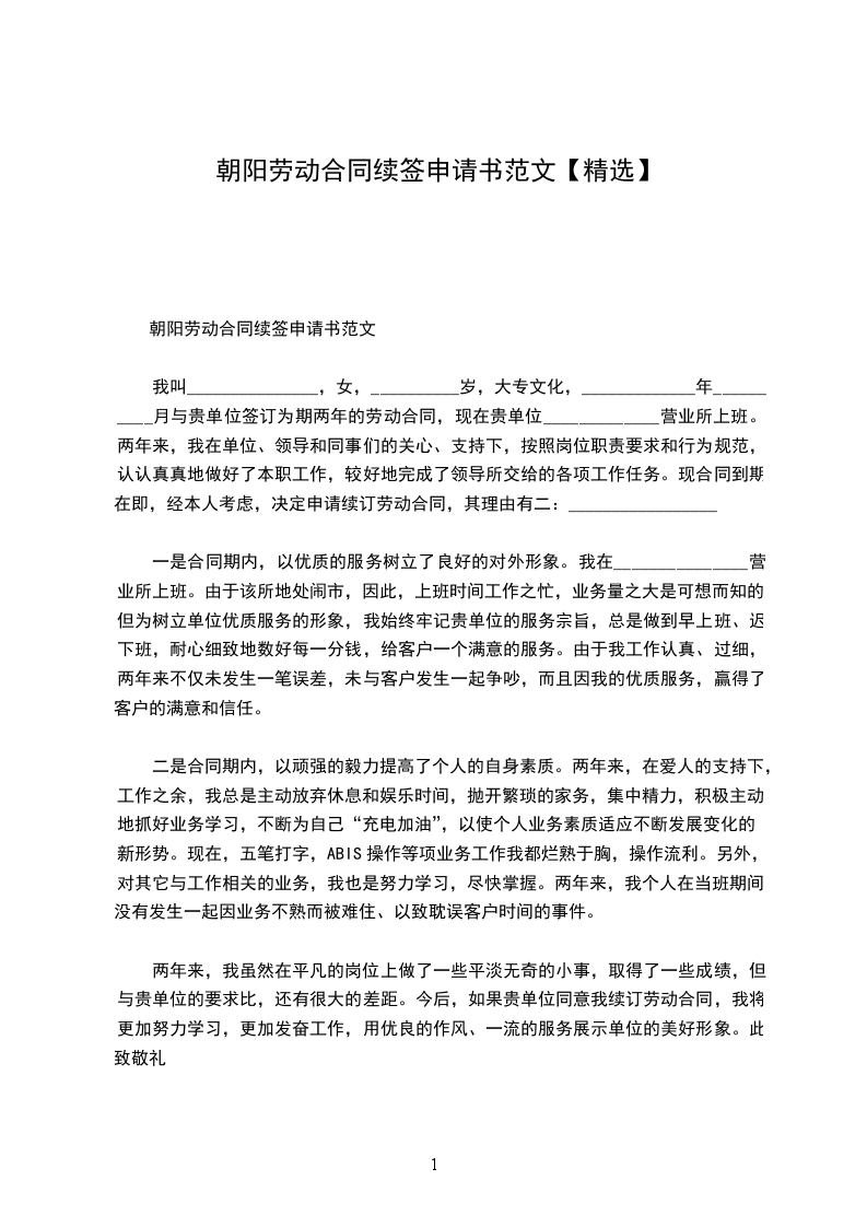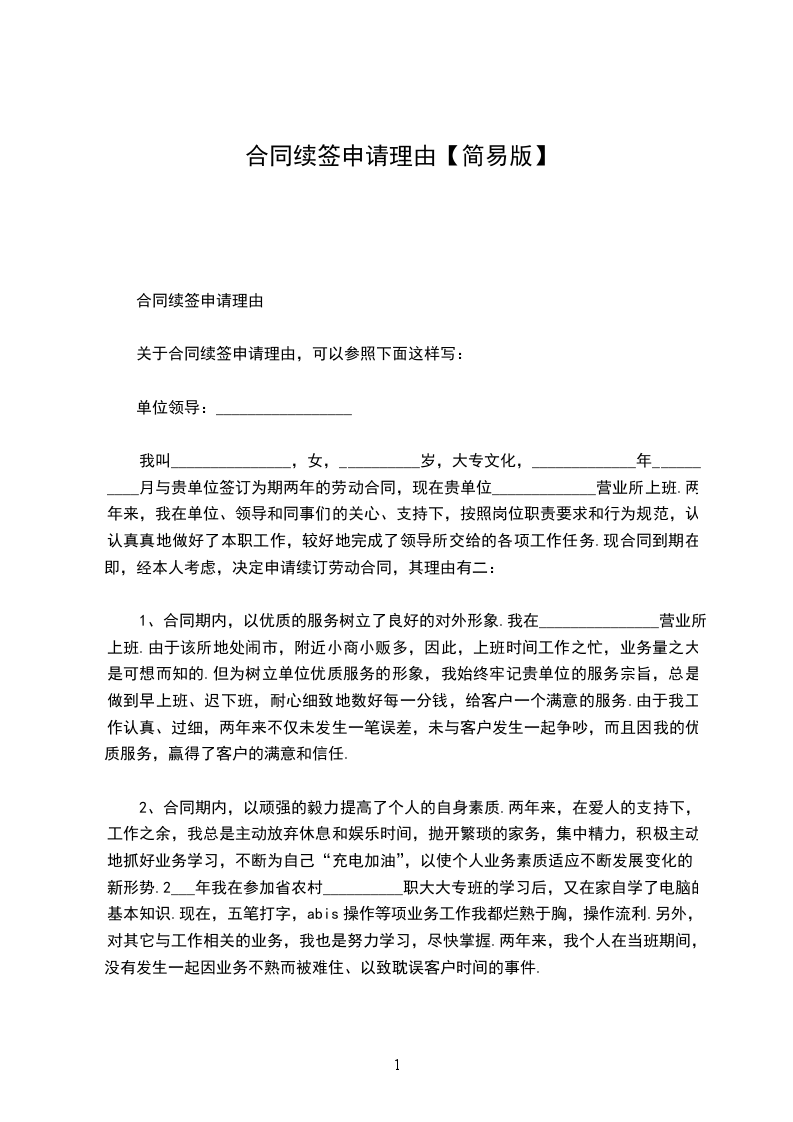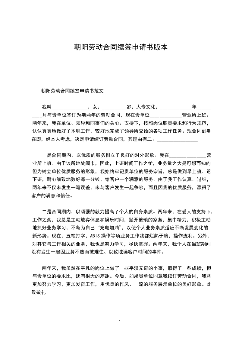 我叫_______________,女,__________岁,大专文化,_____________年__________月与贵单位签订为期两年的劳动合同,现在贵单位_____________营业所上班。两年来,我在单位、领导和同事们的关心、支持下,按照岗位职责要求和行为规范,认认真真地做好了本职工作,较好地完成了领导所交给的各项工作任务。现合同到期在即,经本人考虑,决定申请续订劳动合同,其理由有二:_________________