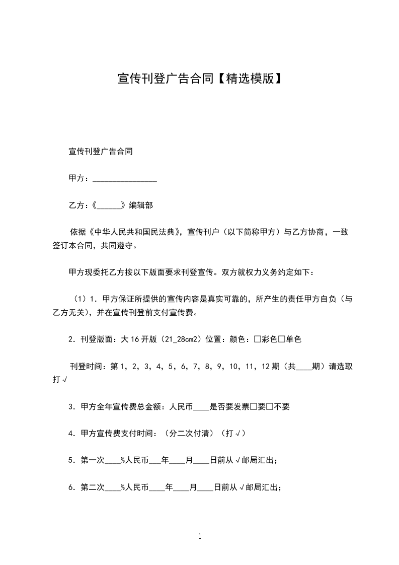 (1)1.甲方保证所提供的宣传内容是真实可靠的,所产生的责任甲方自负(与乙方无关),并在宣传刊登前支付宣传费。