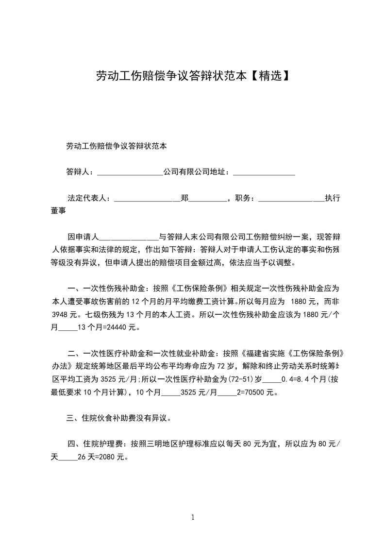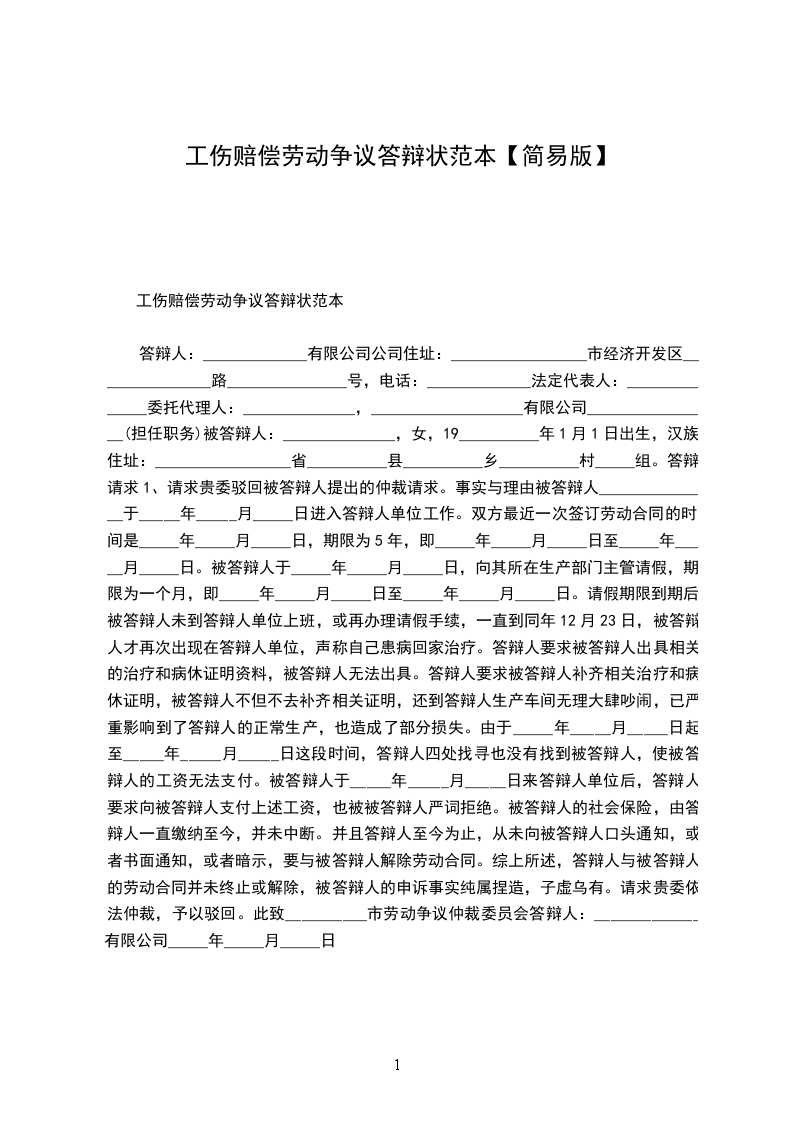 劳动工伤赔偿争议答辩状范本