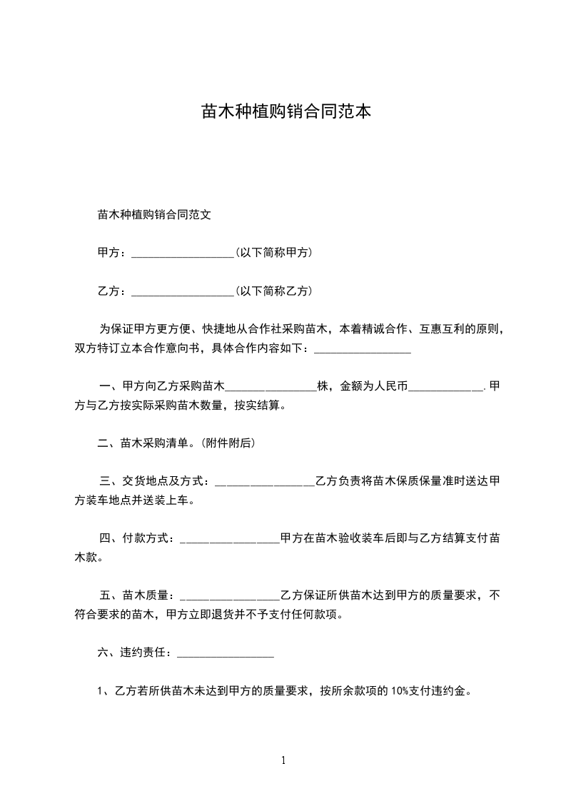 一、甲方向乙方采购苗木________________株,金额为人民币_____________.甲方与乙方按实际采购苗木数量,按实结算。