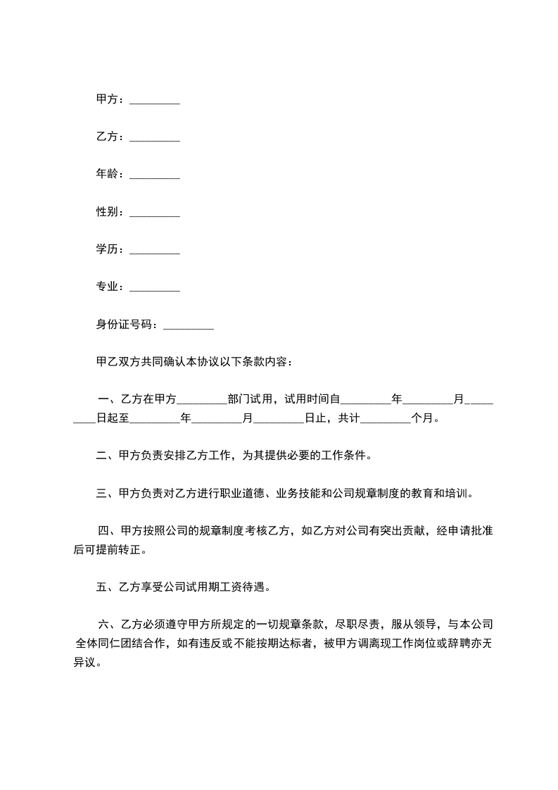 一、乙方在甲方_________部门试用,试用时间自_________年_________月_________日起至_________年_________月_________日止,共计_________个月。