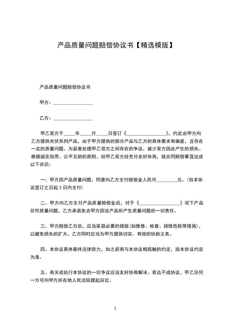 一、甲方因产品质量问题,同意向乙方支付赔偿金人民币_________元。(自本协议签订之日起3日内支付)