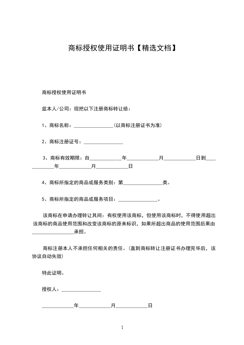 商标授权使用证明书