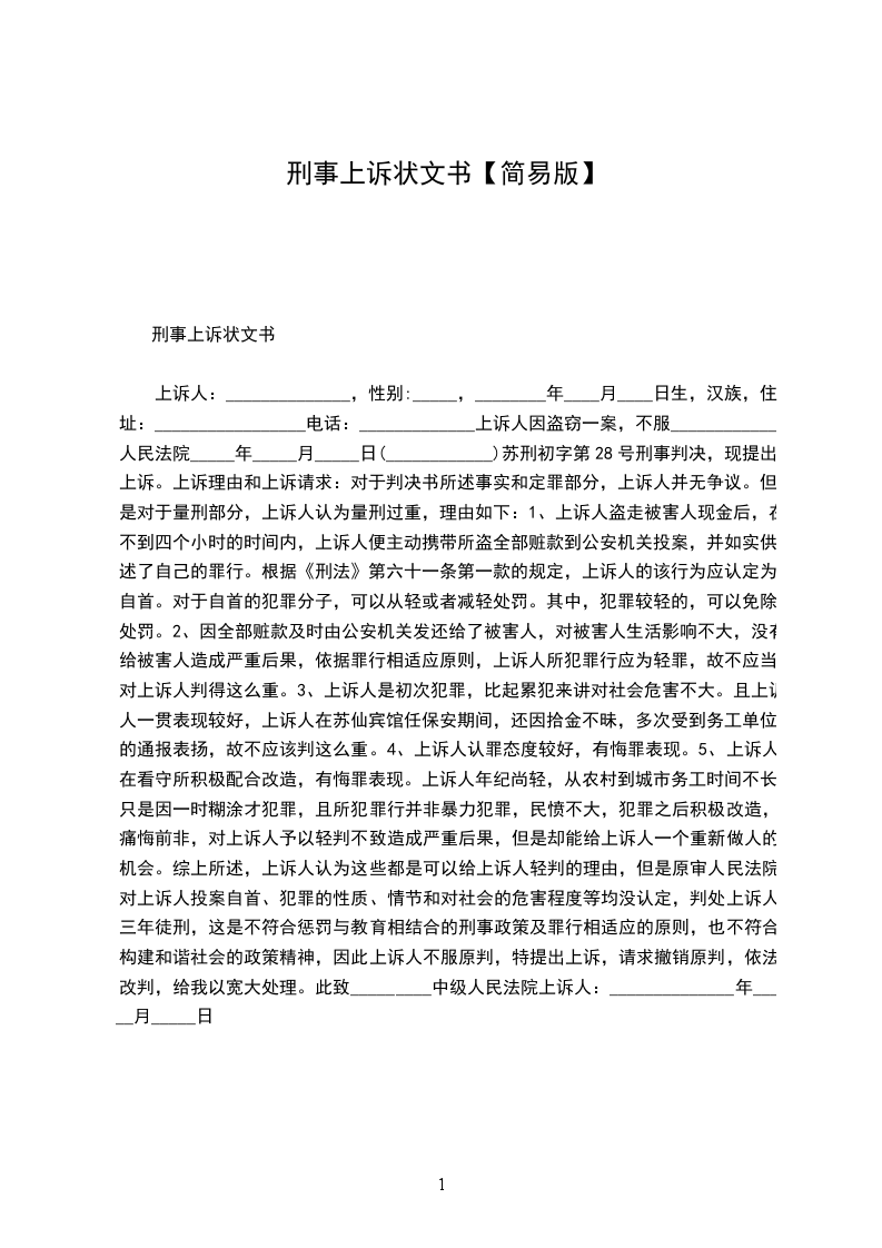 上诉人:______________,性别:_____,________年____月____日生,汉族,住址:_________________电话:_____________上诉人因盗窃一案,不服____________人民法院_____年_____月_____日(____________)苏刑初字第28号刑事判决,现提出上诉。上诉理由和上诉请求:对于判决书所述事实和定罪部分,上诉人并无争议。但是对于量刑部分,上诉人认为量刑过重,理由如下:1、上诉人盗走被害人现金后,在不到四个小时的时间内,上诉人便主动携带所盗全部赃款到公安机关投案,并如实供述了自己的罪行。根据《刑法》第六十一条第一款的规定,上诉人的该行为应认定为自首。对于自首的犯罪分子,可以从轻或者减轻处罚。其中,犯罪较轻的,可以免除处罚。2、因全部赃款及时由公安机关发还给了被害人,对被害人生活影响不大,没有给被害人造成严重后果,依据罪行相适应原则,上诉人所犯罪行应为轻罪,故不应当对上诉人判得这么重。3、上诉人是初次犯罪,比起累犯来讲对社会危害不大。且上诉人一贯表现较好,上诉人在苏仙宾馆任保安期间,还因拾金不昧,多次受到务工单位的通报表扬,故不应该判这么重。4、上诉人认罪态度较好,有悔罪表现。5、上诉人在看守所积极配合改造,有悔罪表现。上诉人年纪尚轻,从农村到城市务工时间不长,只是因一时糊涂才犯罪,且所犯罪行并非暴力犯罪,民愤不大,犯罪之后积极改造,痛悔前非,对上诉人予以轻判不致造成严重后果,但是却能给上诉人一个重新做人的机会。综上所述,上诉人认为这些都是可以给上诉人轻判的理由,但是原审人民法院对上诉人投案自首、犯罪的性质、情节和对社会的危害程度等均没认定,判处上诉人三年徒刑,这是不符合惩罚与教育相结合的刑事政策及罪行相适应的原则,也不符合构建和谐社会的政策精神,因此上诉人不服原判,特提出上诉,请求撤销原判,依法改判,给我以宽大处理。此致_________中级人民法院上诉人:______________年_____月_____日