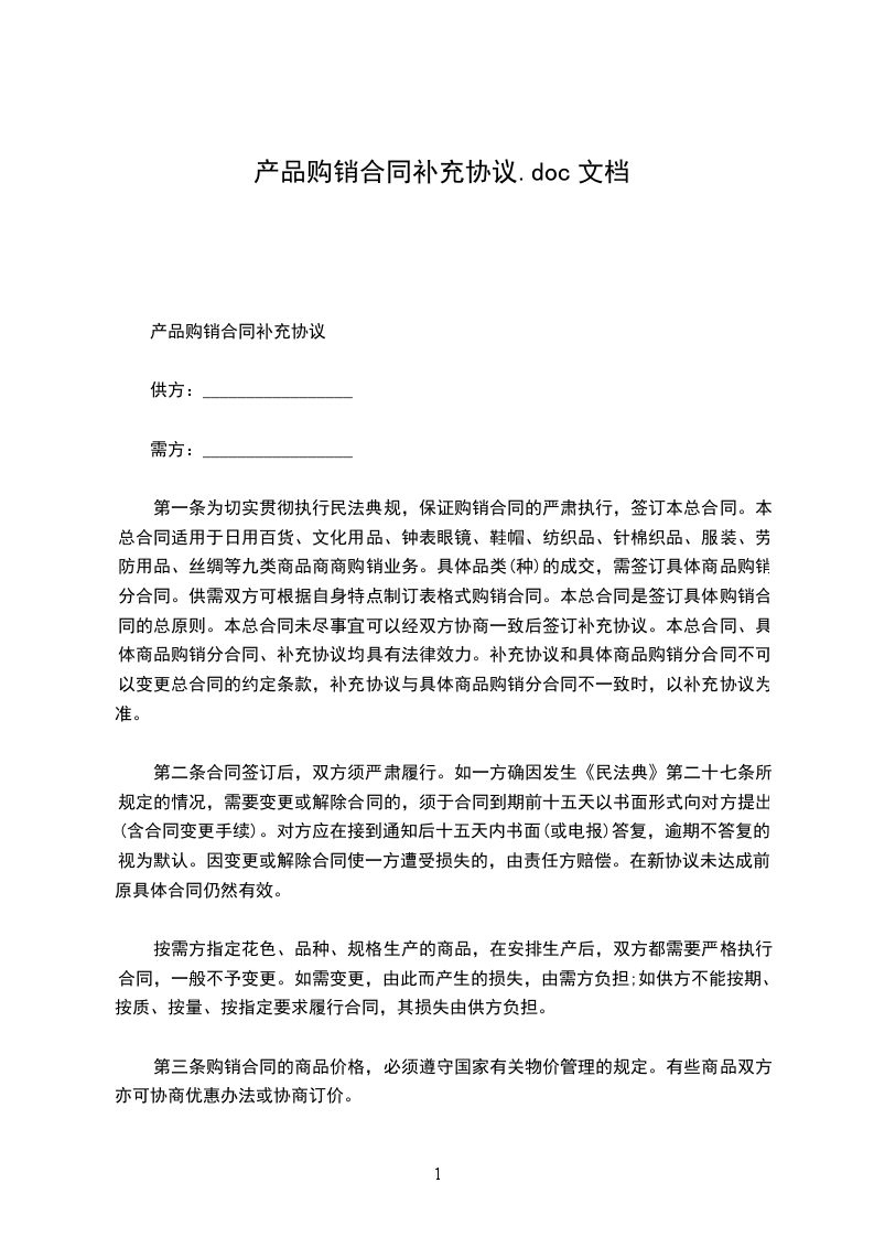 第一条为切实贯彻执行民法典规,保证购销合同的严肃执行,签订本总合同。本总合同适用于日用百货、文化用品、钟表眼镜、鞋帽、纺织品、针棉织品、服装、劳防用品、丝绸等九类商品商商购销业务。具体品类(种)的成交,需签订具体商品购销分合同。供需双方可根据自身特点制订表格式购销合同。本总合同是签订具体购销合同的总原则。本总合同未尽事宜可以经双方协商一致后签订补充协议。本总合同、具体商品购销分合同、补充协议均具有法律效力。补充协议和具体商品购销分合同不可以变更总合同的约定条款,补充协议与具体商品购销分合同不一致时,以补充协议为准。