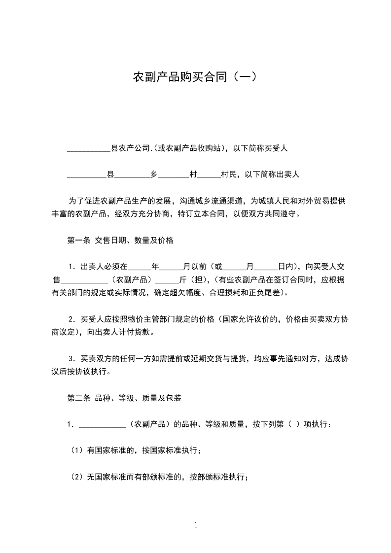 1.出卖人必须在______年______月以前(或______月______日内),向买受人交售____________(农副产品)______斤(担),(有些农副产品在签订合同时,应根据有关部门的规定或实际情况,确定超欠幅度、合理损耗和正负尾差)。