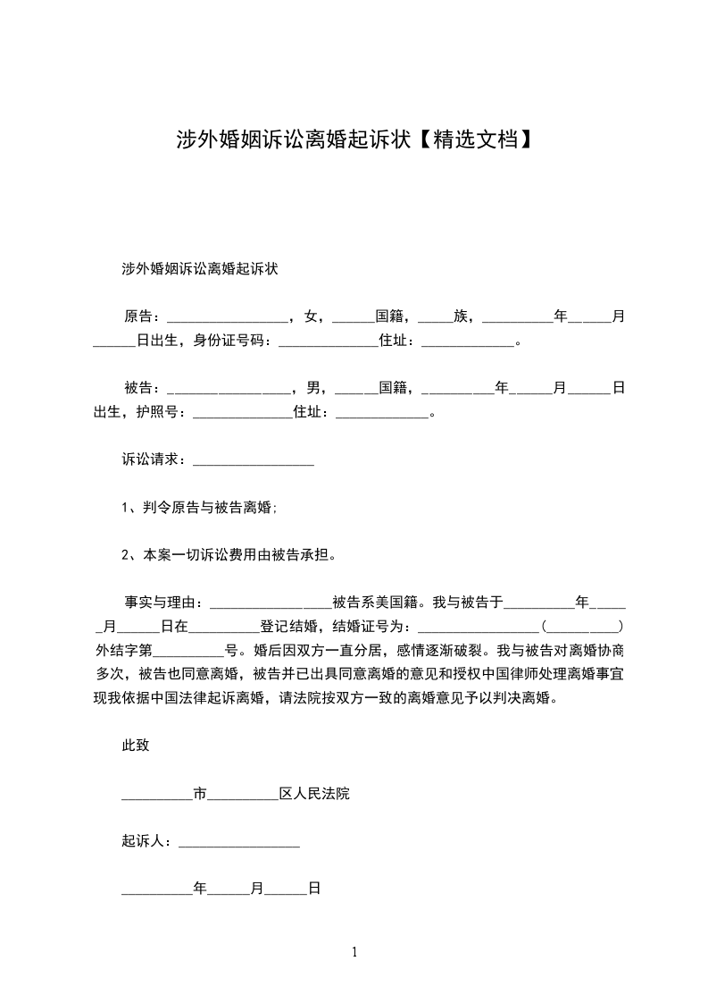 涉外婚姻诉讼离婚起诉状