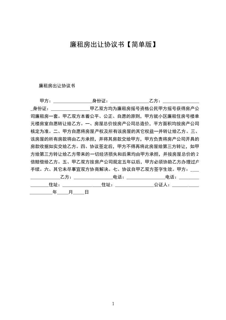 甲方:_________________身份证:_________________乙方:_________________身份证:_________________甲乙双方均为廉租房摇号资格公民甲方摇号获得房产公司廉租房一套。甲乙双方本着公平、公正、自愿的原则,甲方就小区廉租住房号楼单元楼房室自愿转让给乙方。一、房屋总价按房产公司总造价,平方面积均按房产公司核定为准。二、甲方自愿将房屋产权及所有该房屋的其它权益一并转让给乙方。三、该房屋的所有房款将由乙方承担,并将其房款交给甲方,甲方负责将房产公司开具的房款收据如实交给乙方。四、协议签定后,甲方不得再将此房屋给第三方转让,如甲方给第三方转让给乙方带来的一切经济损失和后果均由甲方承担,并按房屋总价的2倍赔偿给乙方。五、甲乙双方按房产公司规定五年以后,甲方必须协助乙方办理过户手续。六、其它未尽事宜双方协商解决。七、协议自甲乙双方签字生效。甲方:_________________乙方:_________________电话:_________________电话:_________________住址:_________________住址:_________________公证人:______________________年_____月_____日