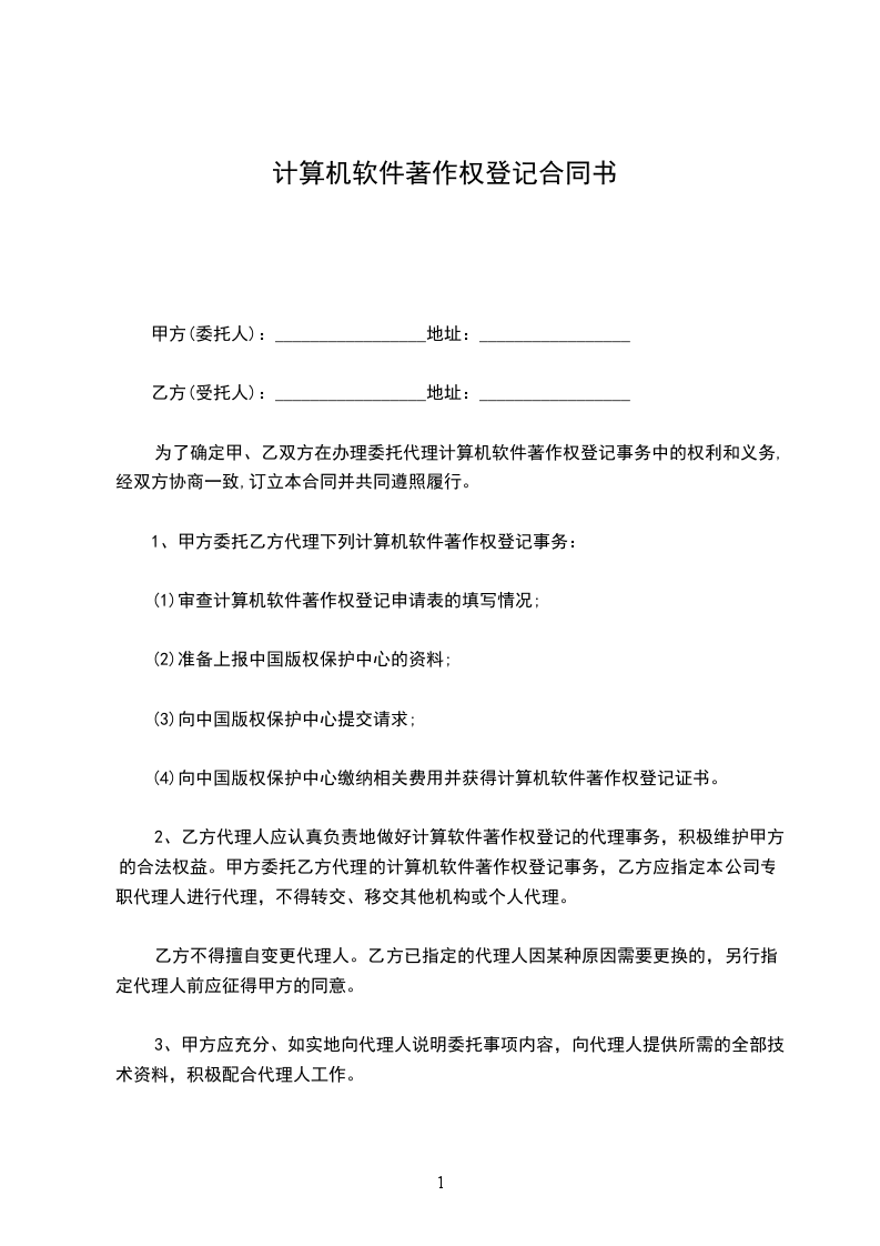 1、甲方委托乙方代理下列计算机软件著作权登记事务: