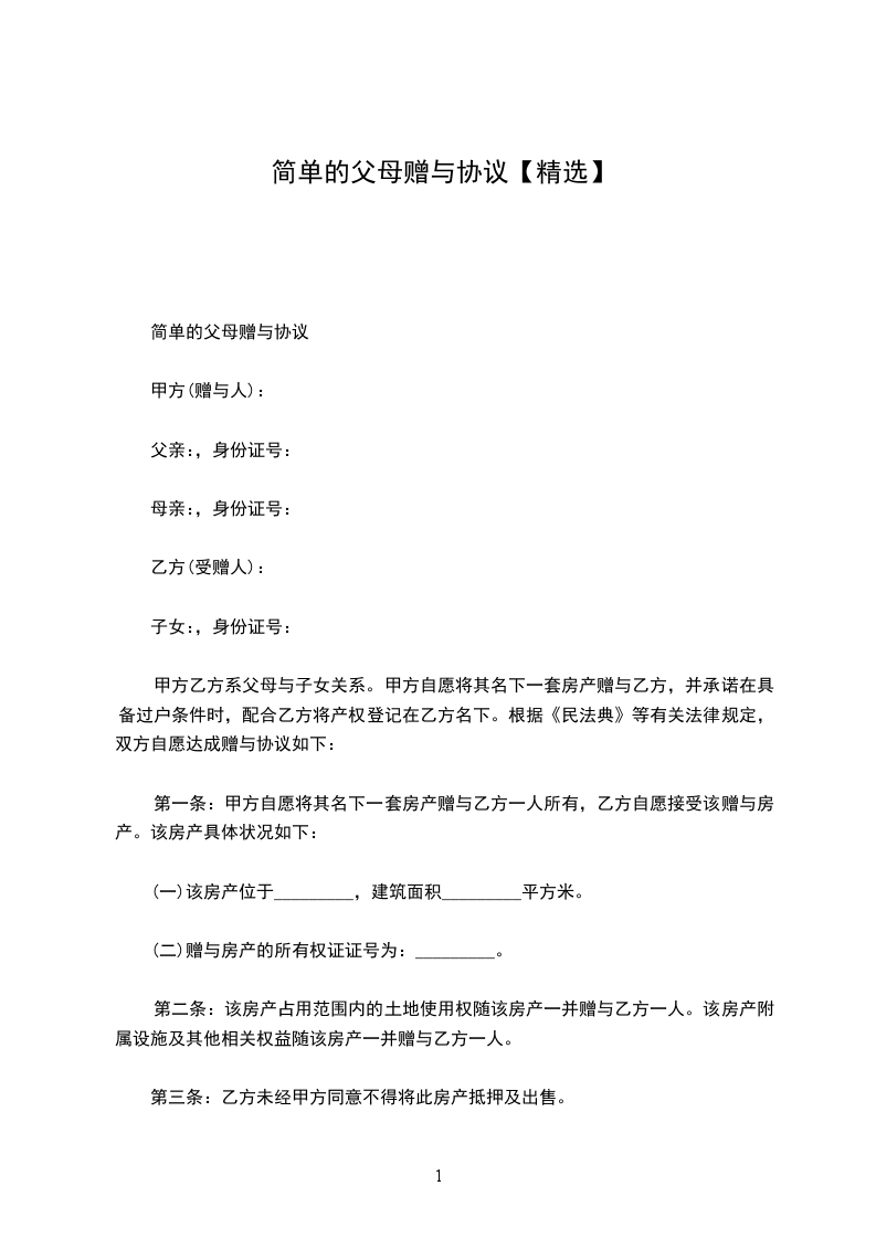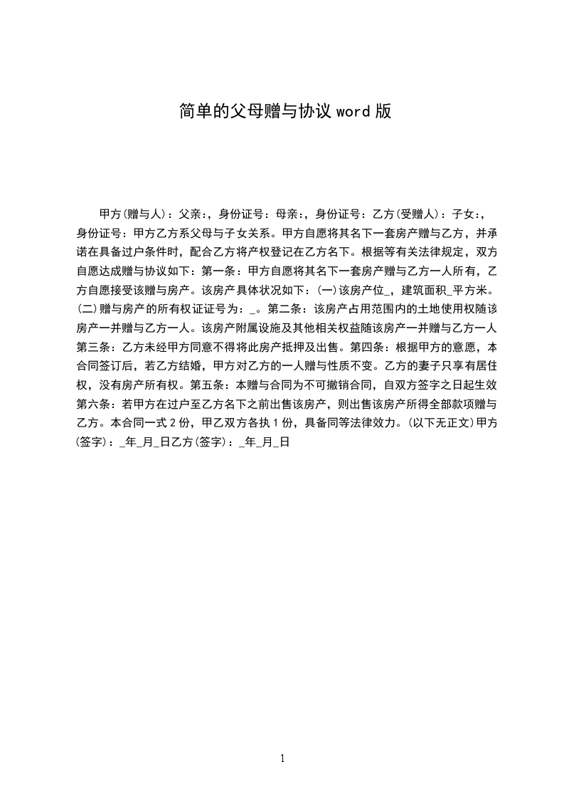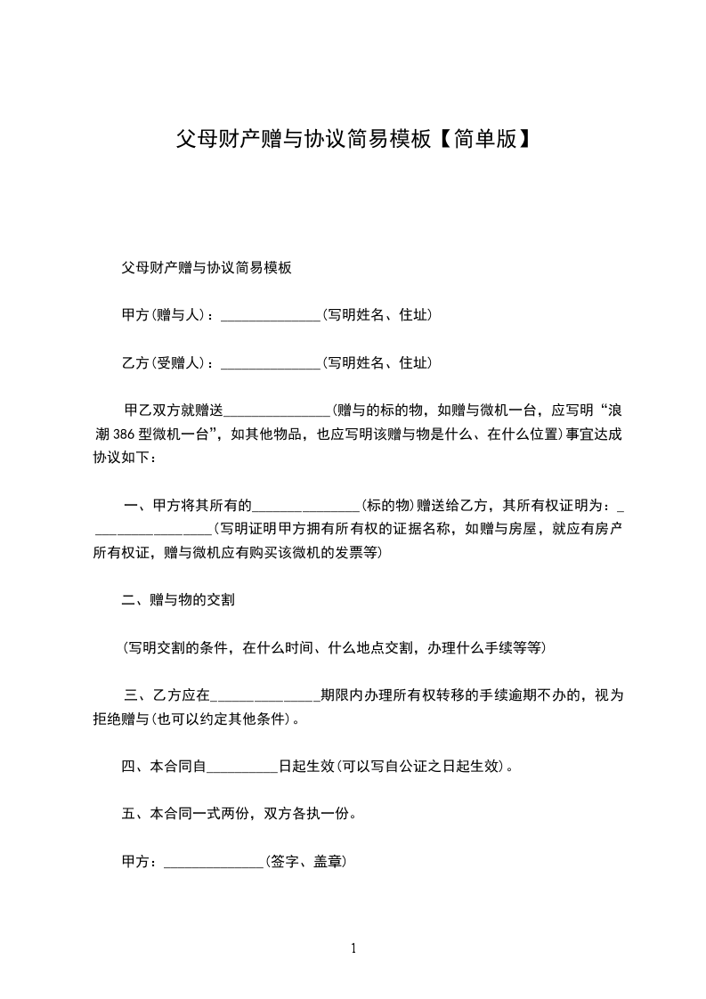 父母赠与简易合同
