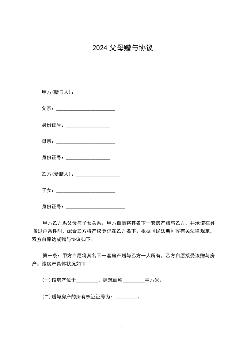 甲方乙方系父母与子女关系。甲方自愿将其名下一套房产赠与乙方,并承诺在具备过户条件时,配合乙方将产权登记在乙方名下。根据《民法典》等有关法律规定,双方自愿达成赠与协议如下: