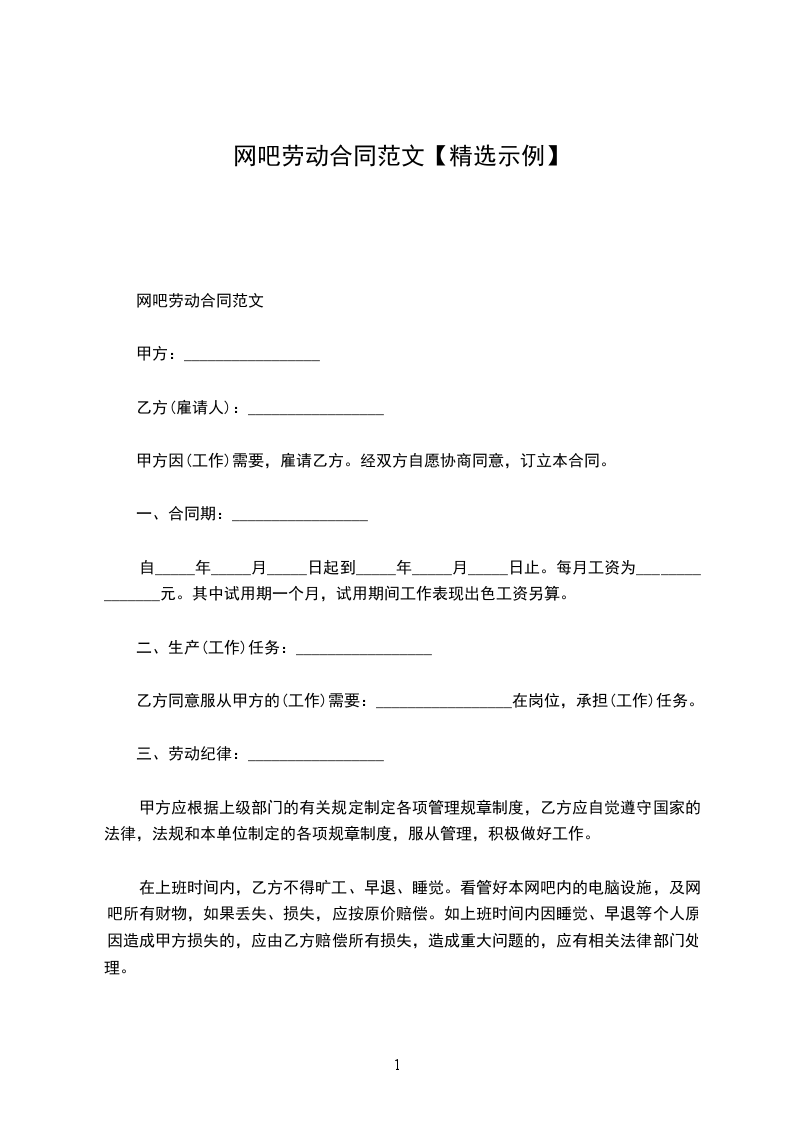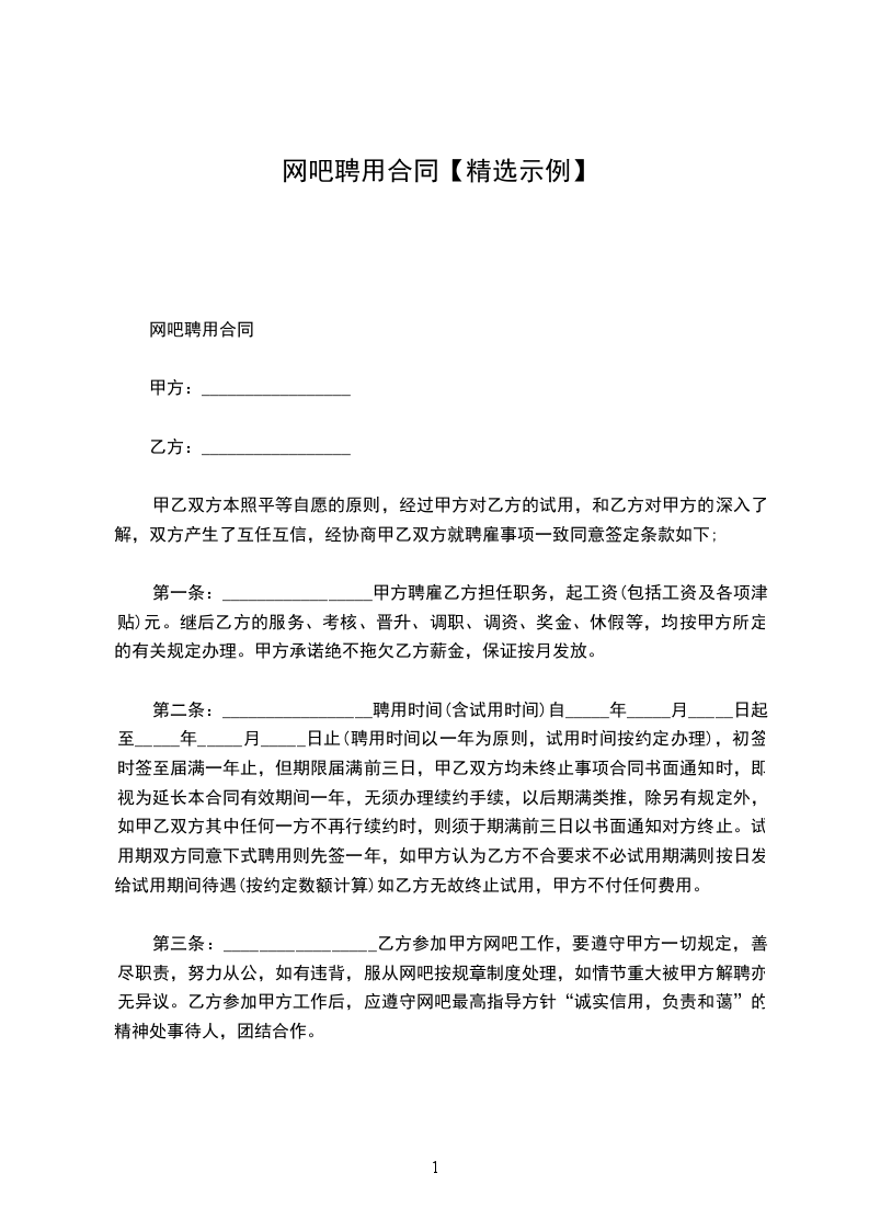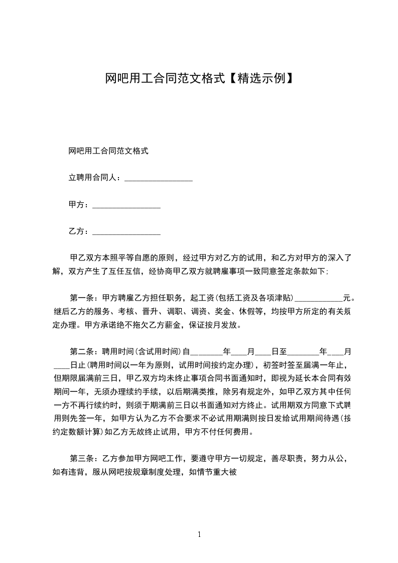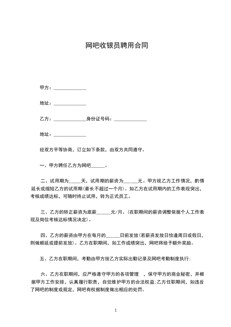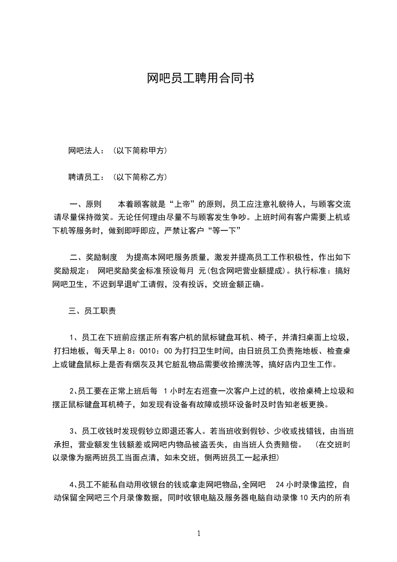 网吧聘用合同