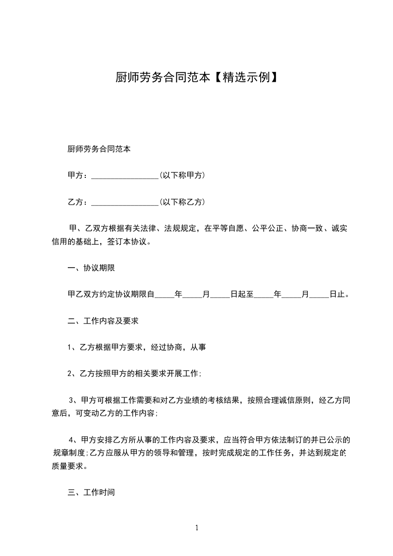 厨师劳务合同范本