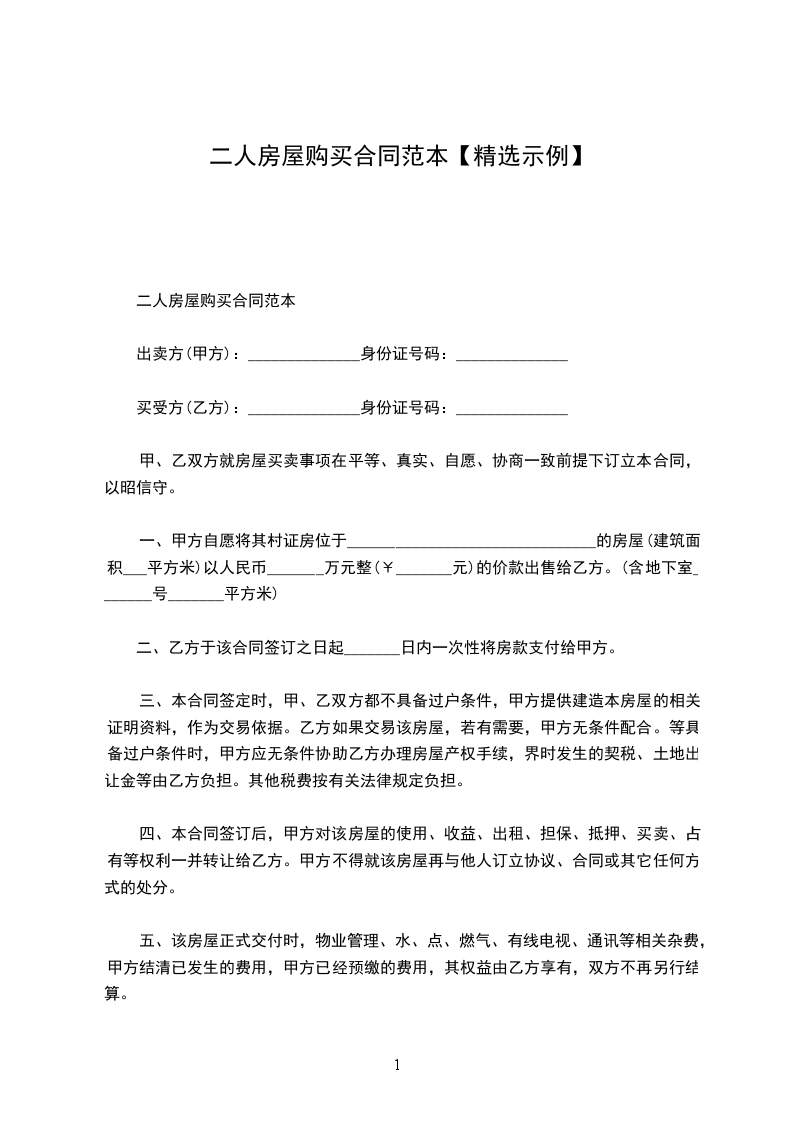 二人房屋购买合同范本