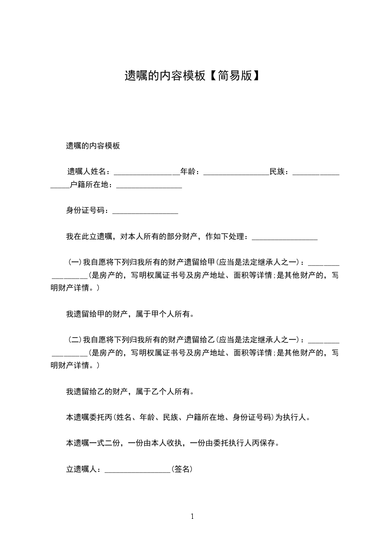 遗嘱人姓名:_________________年龄:_________________民族:_________________户籍所在地:_________________