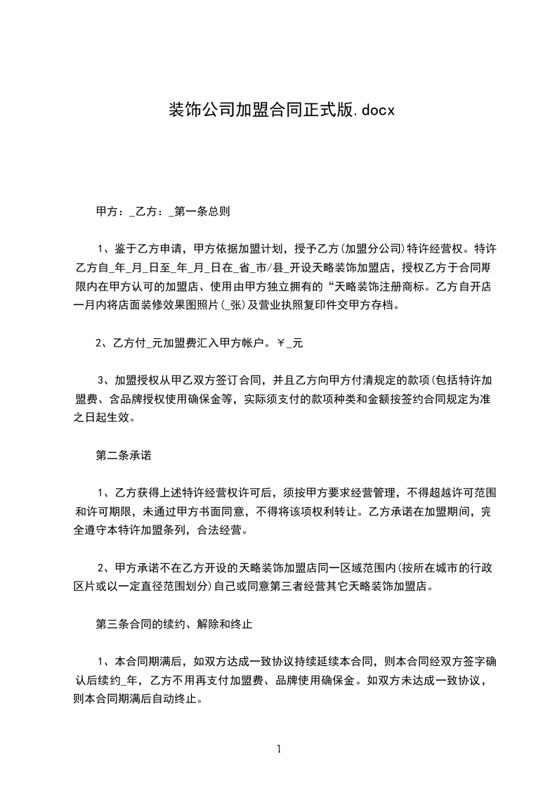 1、甲乙双方本着平等、自愿、互惠互利、共同发展的原则,为了进一步拓展市场,更好地开展装饰工程业务,经协商就乙方加盟甲方的事项,达成共识并签订本协议。