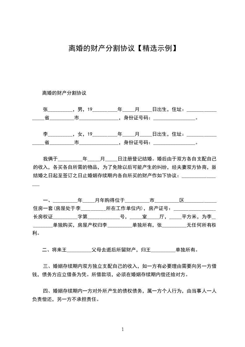 一、__________年_____月年购得位于__________市__________区_____________住房一套(房屋处于李__________所在工作单位内),房产证号:_________________长房权证__________字第_____________号,_____室_____厅,_____平方米,为李__________单独购买,房屋产权归李__________单独所有,张__________无任何所有权利。