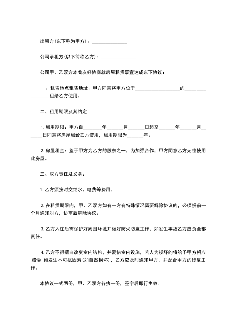 2.房屋租金:鉴于甲方为乙方的股东之一,为加强合作,甲方同意乙方无偿使用此房屋。