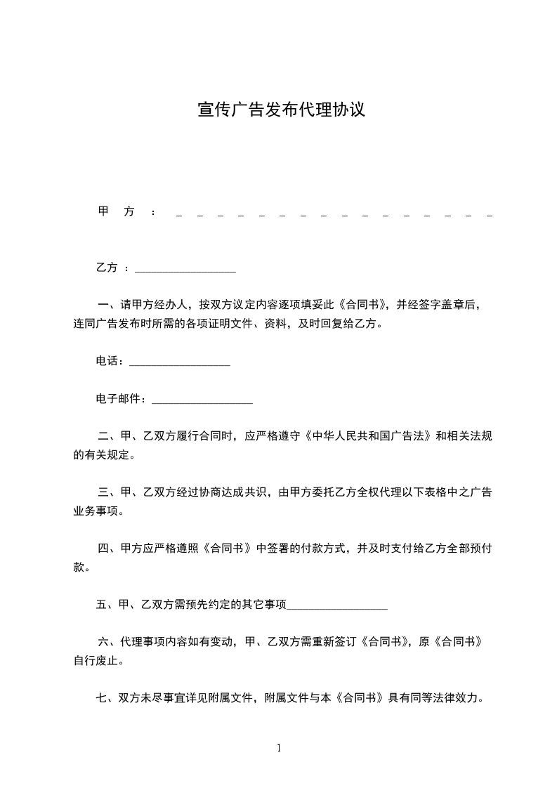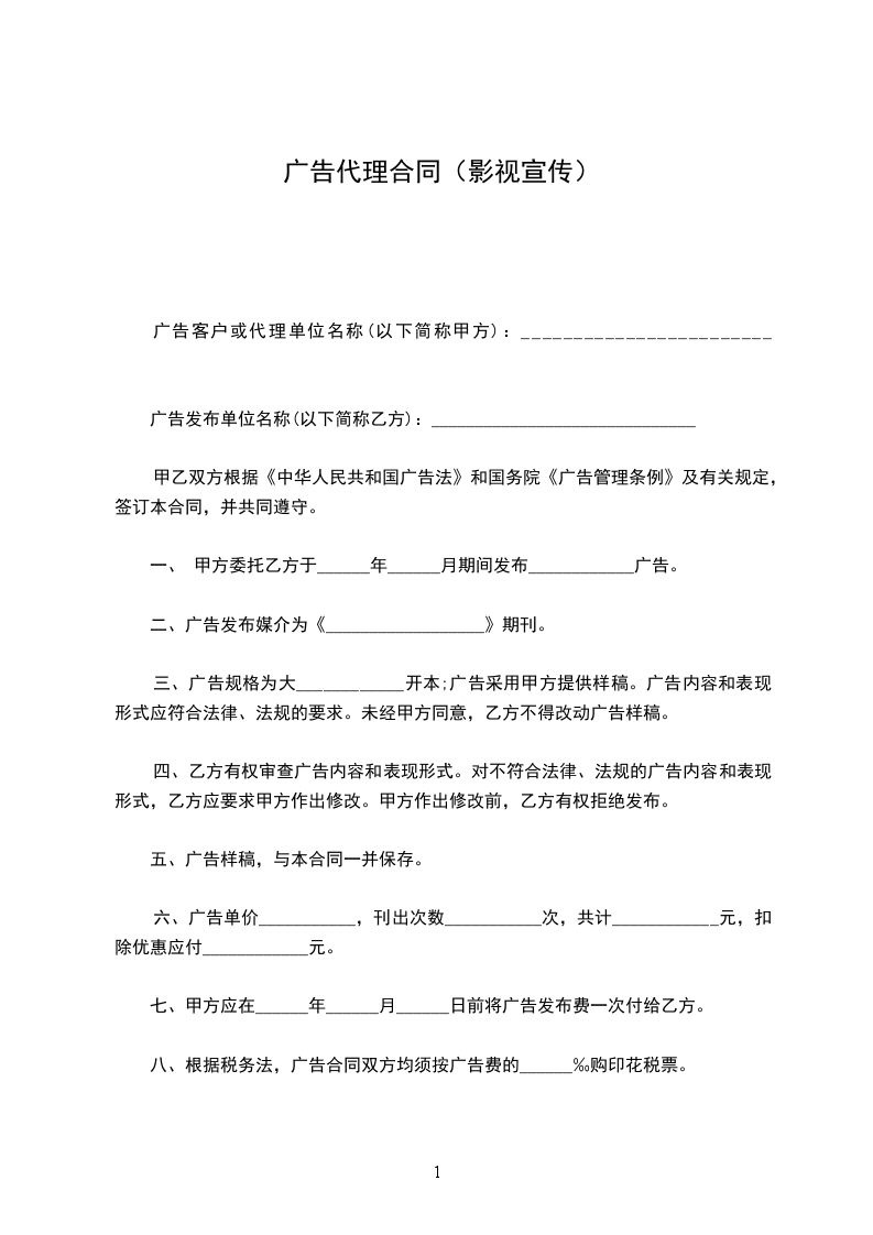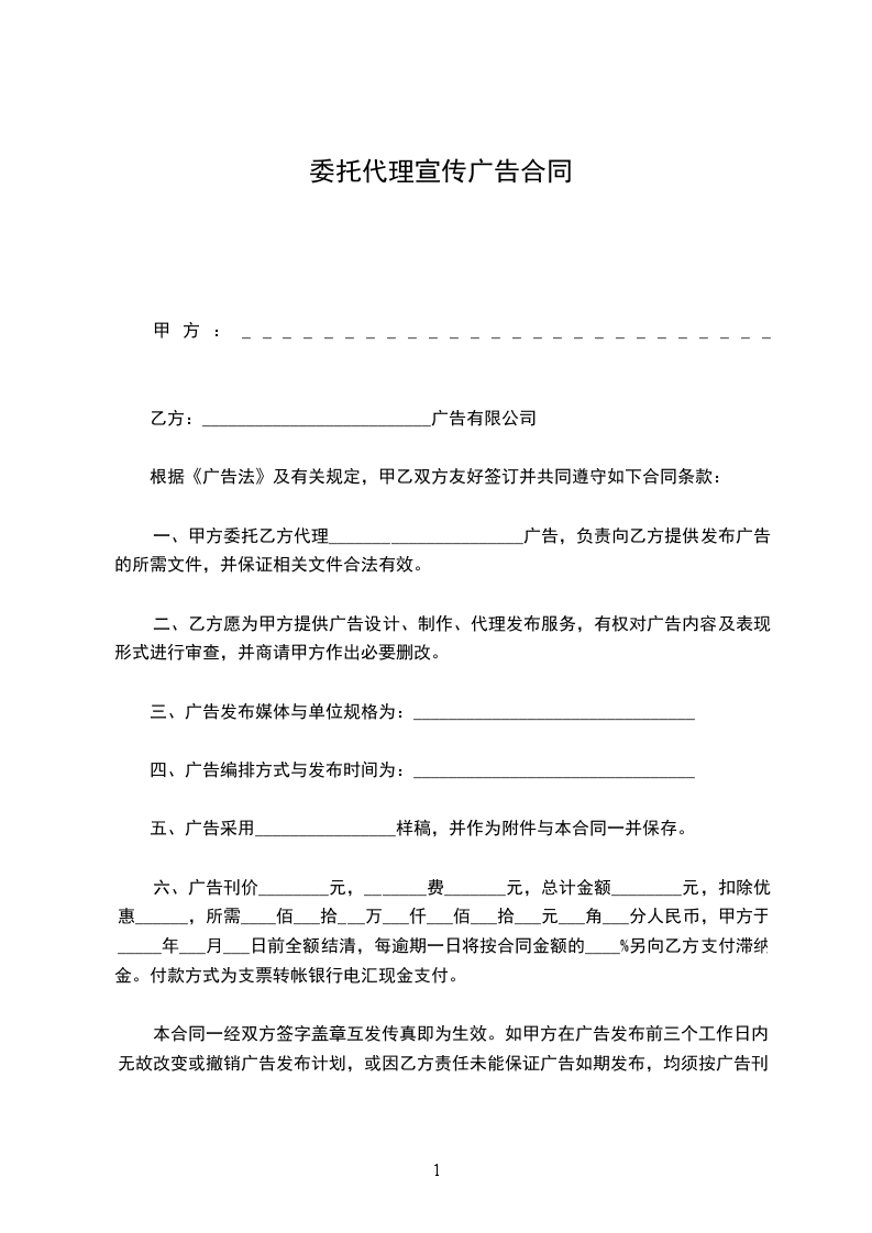 10、甲乙双方约定乙方代理广告期限暂为一年(_____________年_____________月_____________日-_____________年_____________月_____________日)。
