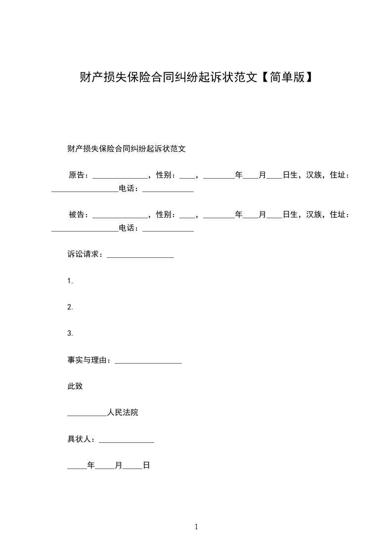 财产损失保险合同纠纷起诉状范文