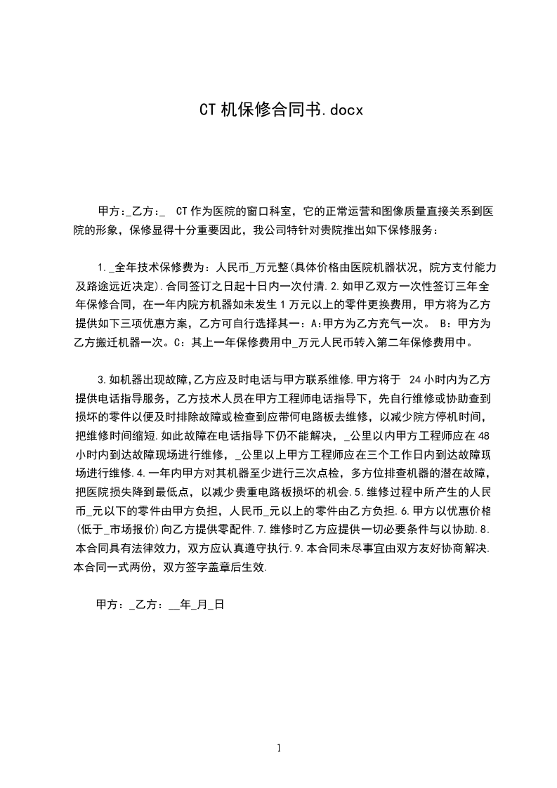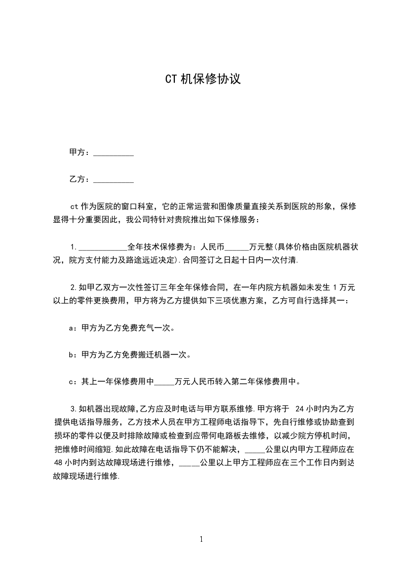 1.全年技术保修费为:人民币______万元(大写:_______)整(具体价格由医院机器状况,院方支付能力及路途远近决定)。合同签订之日起_____日内一次付清。