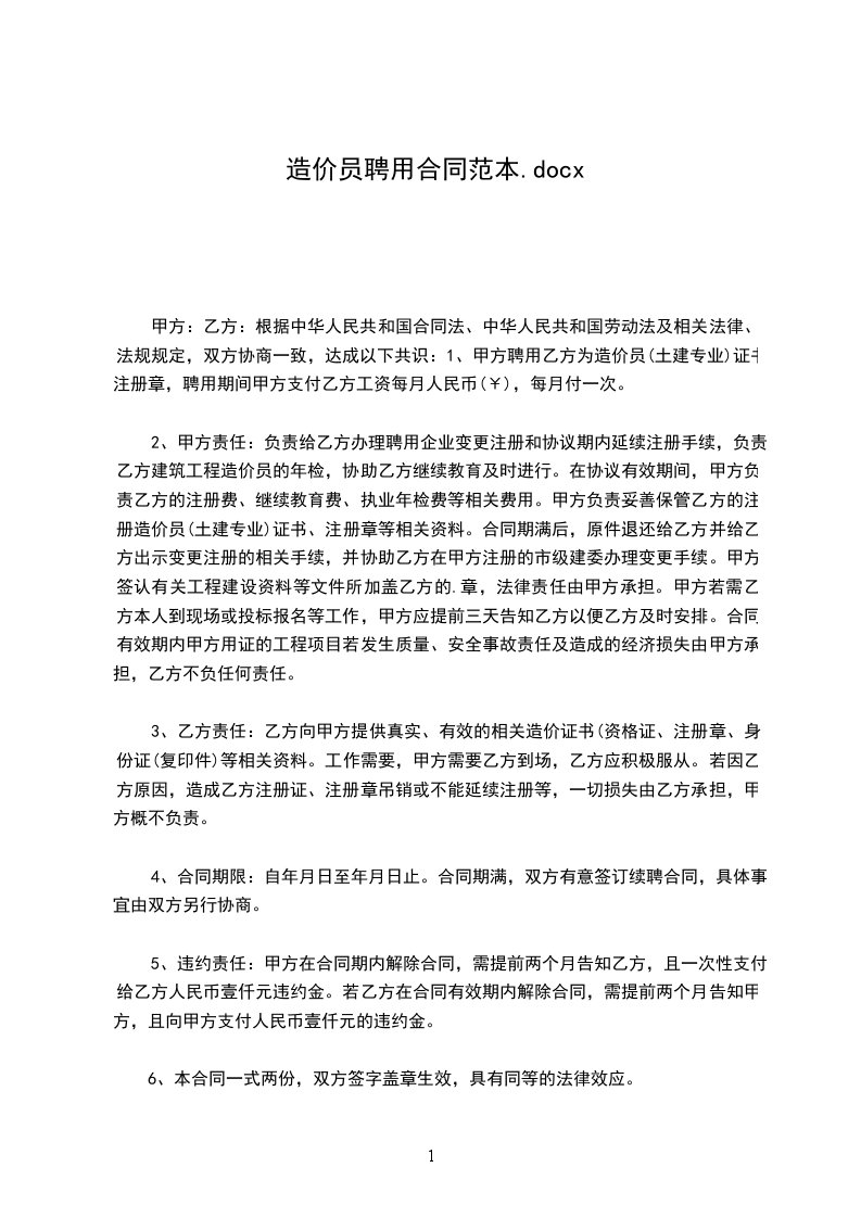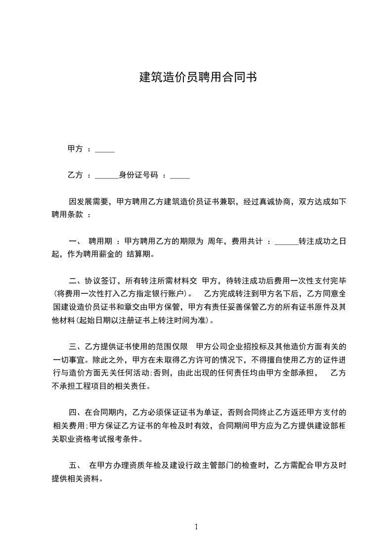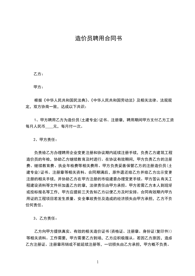 1、甲方聘用乙方为造价员(土建专业)证书、注册章,聘用期间甲方支付乙方工资每月人民币____元,每月付一次。