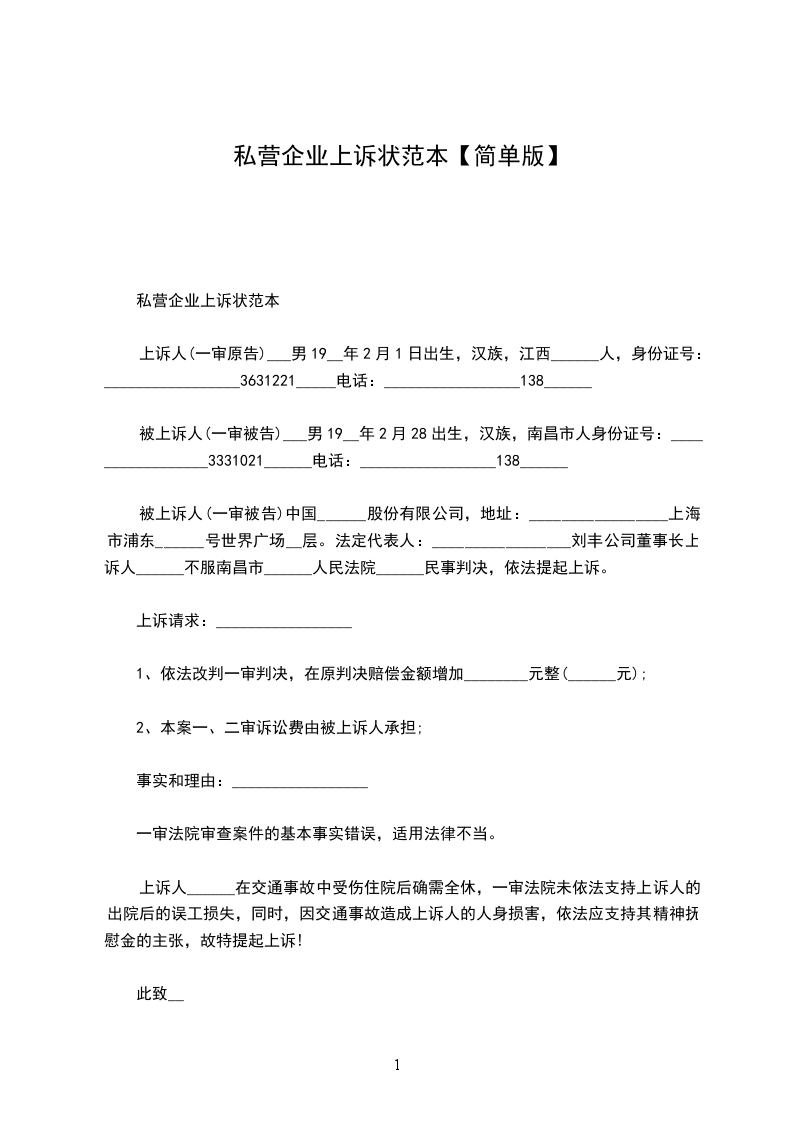 上诉人(一审原告)___男19__年2月1日出生,汉族,江西______人,身份证号:_________________3631221_____电话:_________________138______