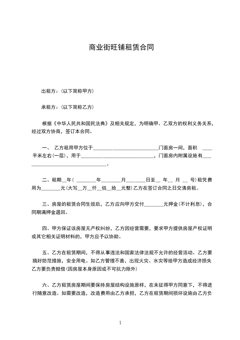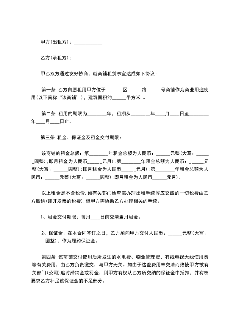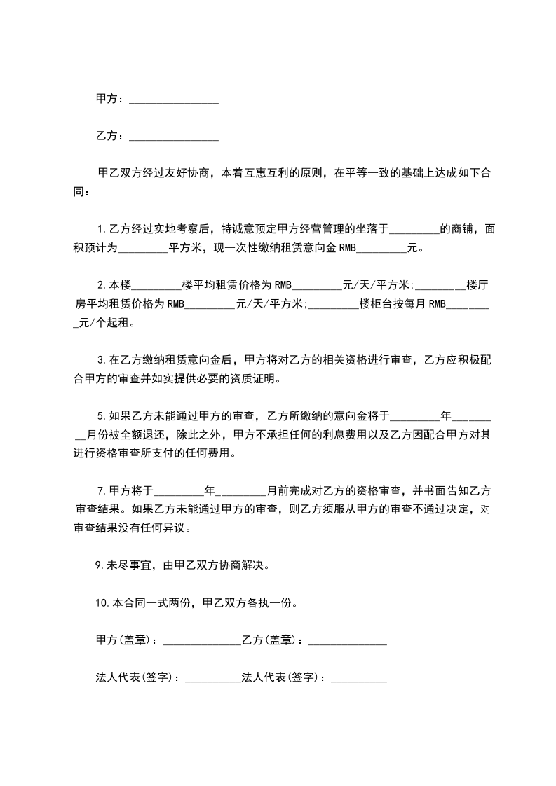 1.乙方经过实地考察后,特诚意预定甲方经营管理的坐落于_________的商铺,面积预计为_________平方米,现一次性缴纳租赁意向金RMB_________元。