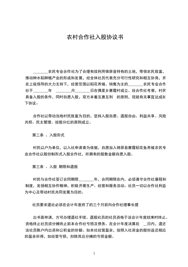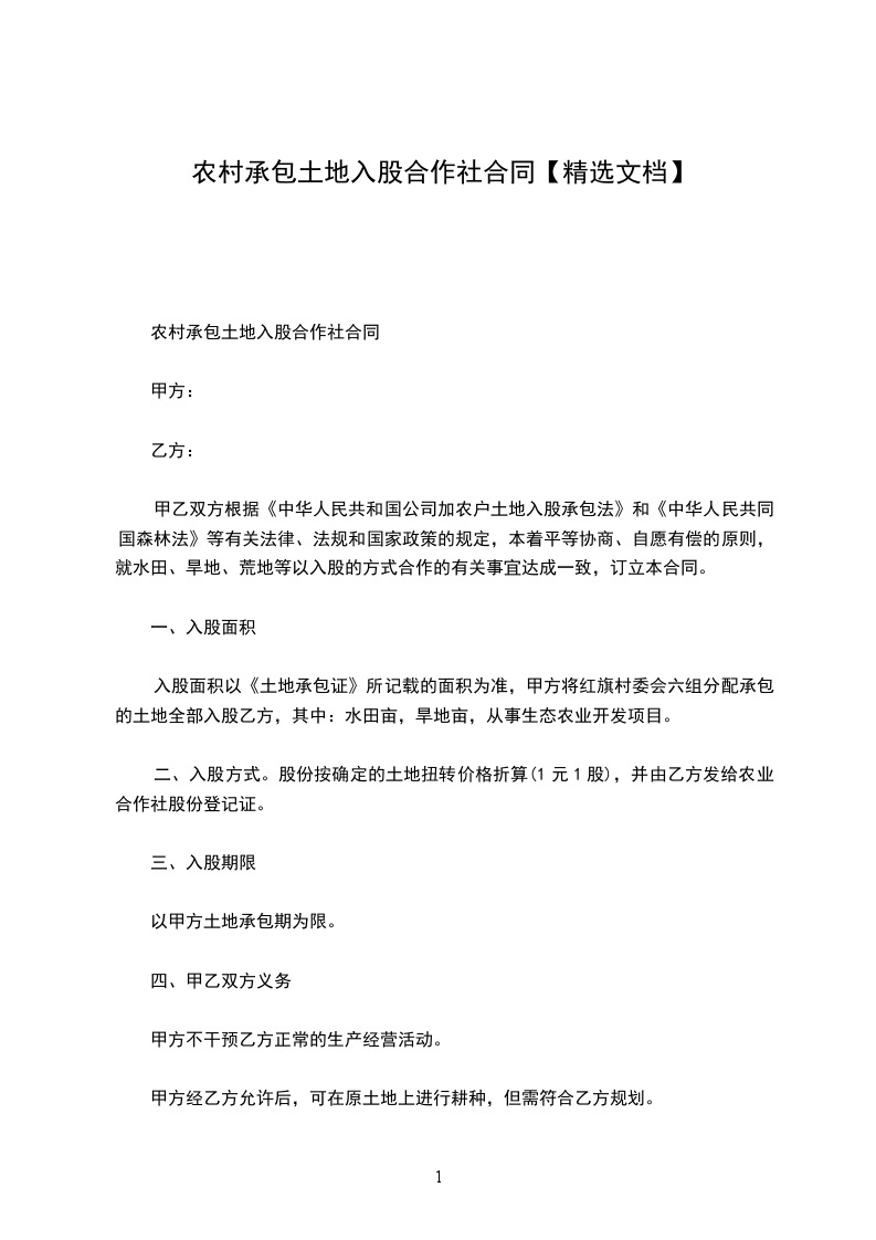 农村承包土地入股合作社合同