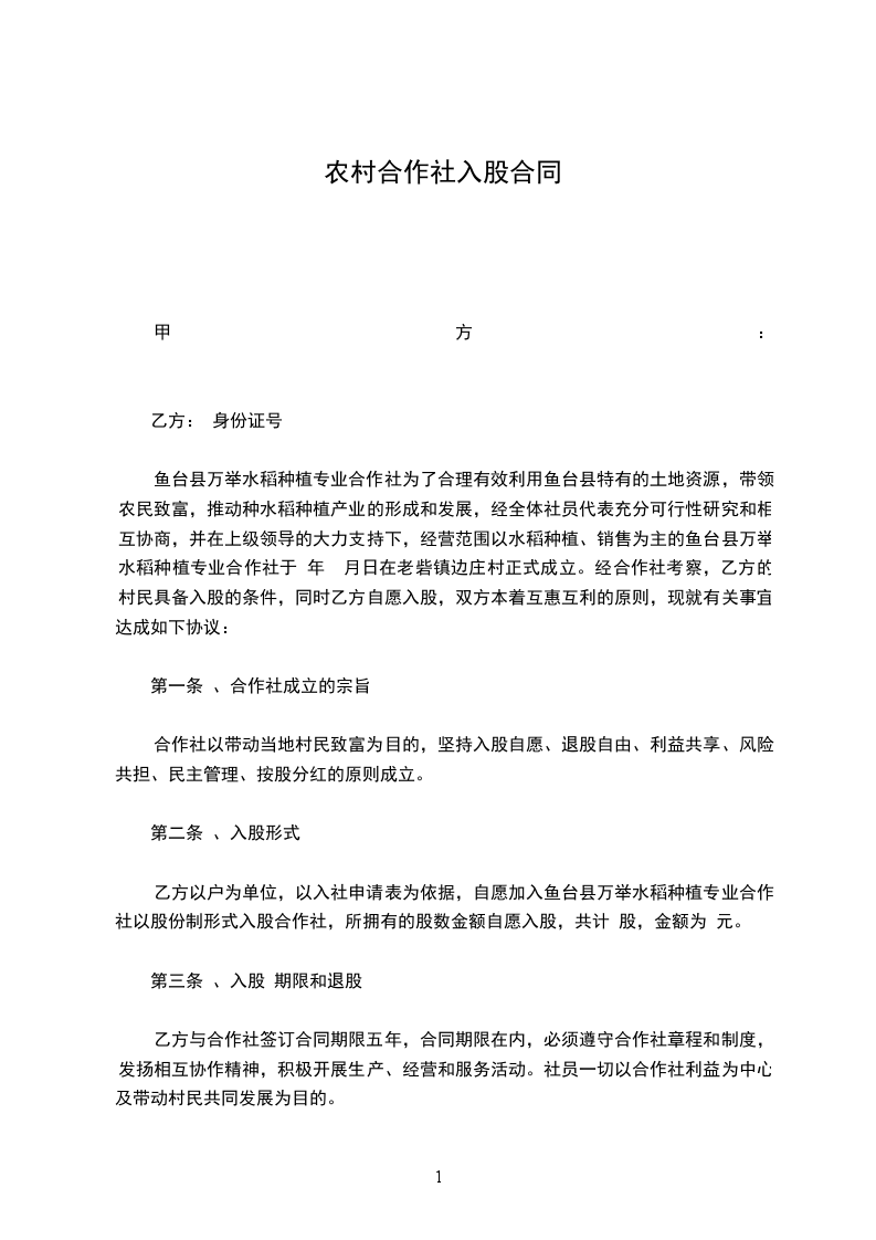 二、入股方式。股份按确定的土地扭转价格折算(1元1股),并由乙方发给农业合作社股份登记证。