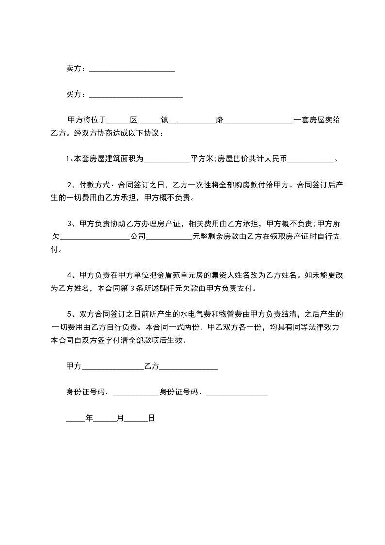 一、甲方保证将套房完整转让给乙方使用,乙方应一次性付清购房款合人民币_________________元正(¥:_________________元)才拥有房屋所有权。