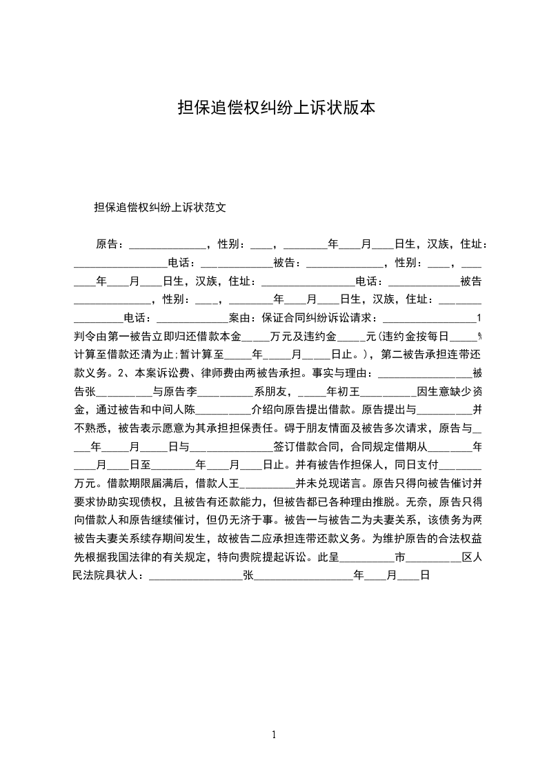 原告:______________,性别:____,________年____月____日生,汉族,住址:_________________电话:_____________被告:______________,性别:____,________年____月____日生,汉族,住址:_________________电话:_____________被告:______________,性别:____,________年____月____日生,汉族,住址:_________________电话:_____________案由:保证合同纠纷诉讼请求:_________________1、判令由第一被告立即归还借款本金_____万元及违约金_____元(违约金按每日_____%计算至借款还清为止;暂计算至_____年_____月_____日止。),第二被告承担连带还款义务。2、本案诉讼费、律师费由两被告承担。事实与理由:_________________被告张__________与原告李__________系朋友,_____年初王__________因生意缺少资金,通过被告和中间人陈__________介绍向原告提出借款。原告提出与__________并不熟悉,被告表示愿意为其承担担保责任。碍于朋友情面及被告多次请求,原告与_____年_____月_____日与_______________签订借款合同,合同规定借期从________年____月____日至________年____月____日止。并有被告作担保人,同日支付________万元。借款期限届满后,借款人王__________并未兑现诺言。原告只得向被告催讨并要求协助实现债权,且被告有还款能力,但被告都已各种理由推脱。无奈,原告只得向借款人和原告继续催讨,但仍无济于事。被告一与被告二为夫妻关系,该债务为两被告夫妻关系续存期间发生,故被告二应承担连带还款义务。为维护原告的合法权益,先根据我国法律的有关规定,特向贵院提起诉讼。此呈__________市__________区人民法院具状人:_________________张__________________年____月____日
