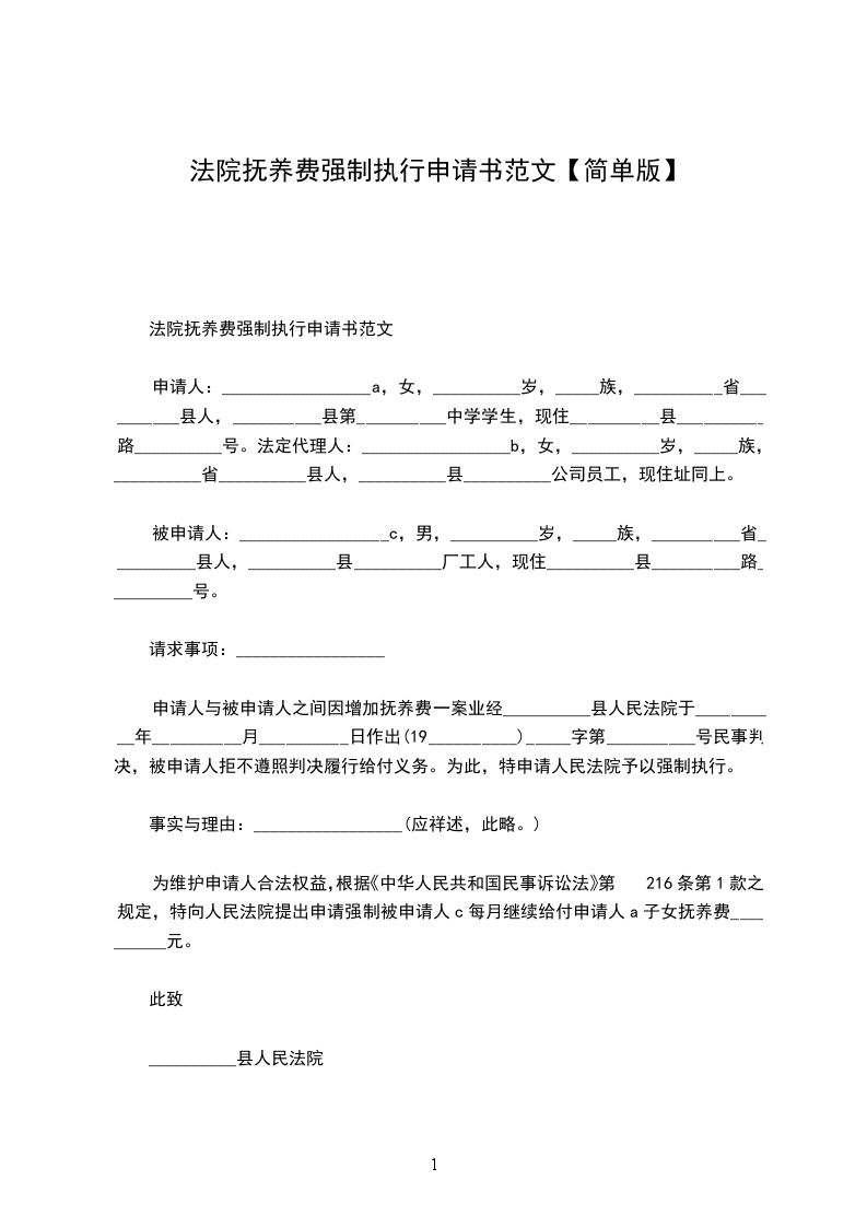 为维护申请人合法权益,根据《中华人民共和国民事诉讼法》第216条第1款之规定,特向人民法院提出申请强制被申请人每月继续给付申请人子女抚养费__________元。