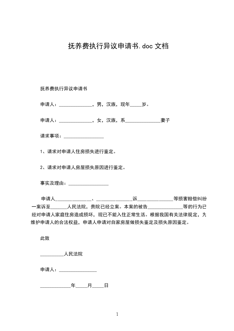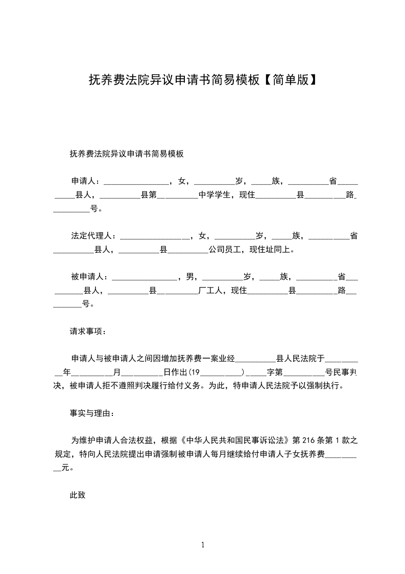 抚养费法院异议申请书简易模板