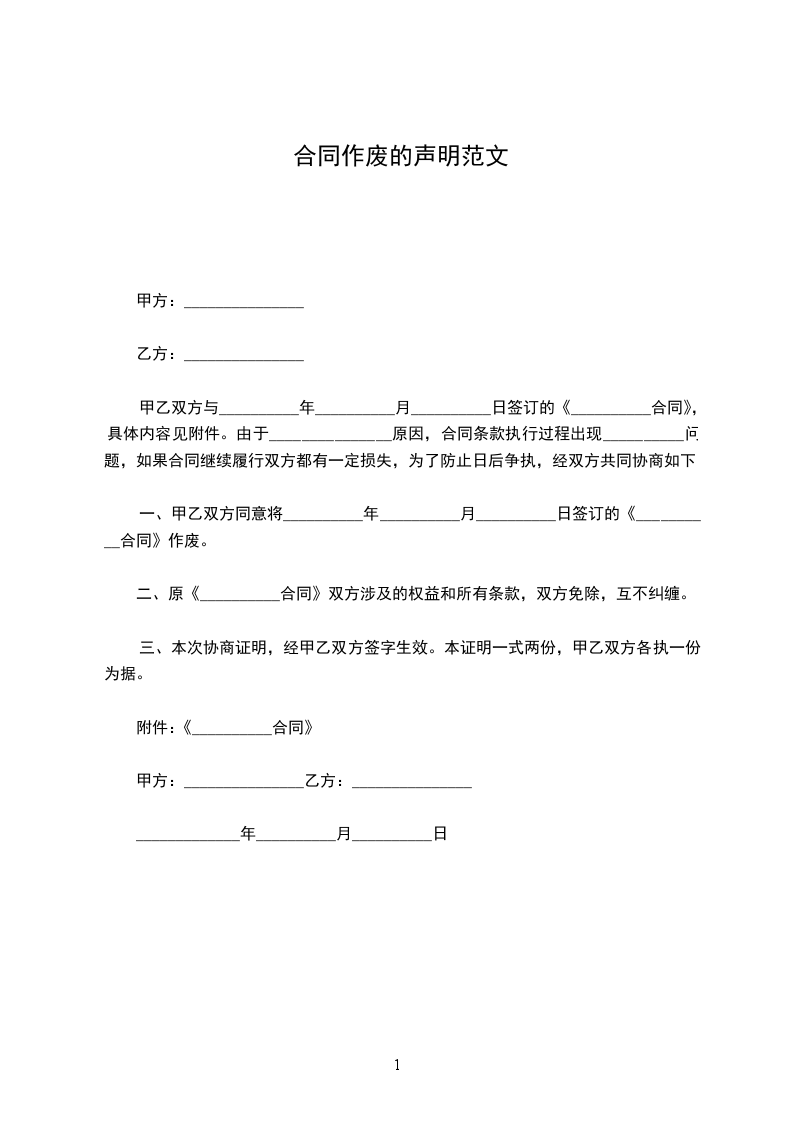 一、甲乙双方同意将__________年__________月__________日签订的《__________合同》作废。