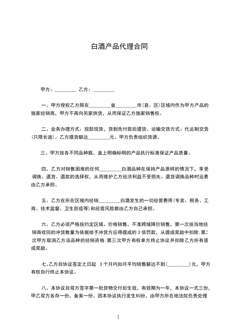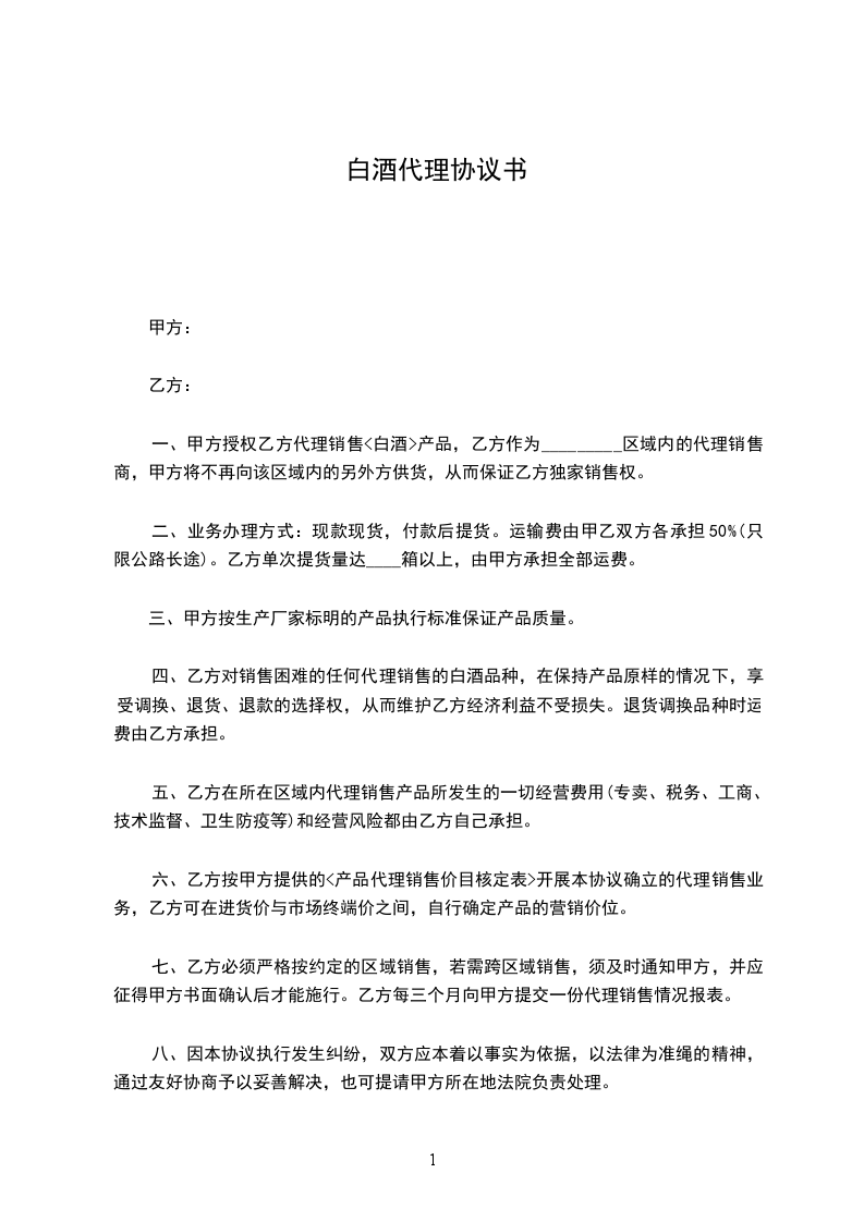 二、代理事项1、代理商级别:市代理/县代理;3、代理期限:从___年___月___日至___年___月___日。双方可于协议期满前___日内续签,否则本协议自行终止;4、首期进货款:乙方每次向甲方进货货款总额不得少于___(大写)元,并承诺遵守所代理产品的市场规则。乙方预付定金,在甲方首次收到不低于酒箱货款后,发出第一批次白酒,价值___元(按提货价计);在甲方收到第二批次不低于酒___箱货款后,发出第二批次白酒,定金在第二批次货款中抵扣货款;5、甲方授权乙方代理的甲方产品为“___系列白酒”;6、甲乙双方的任何一方对另一方的商业行为和法律行为及经营风险不承担责任。