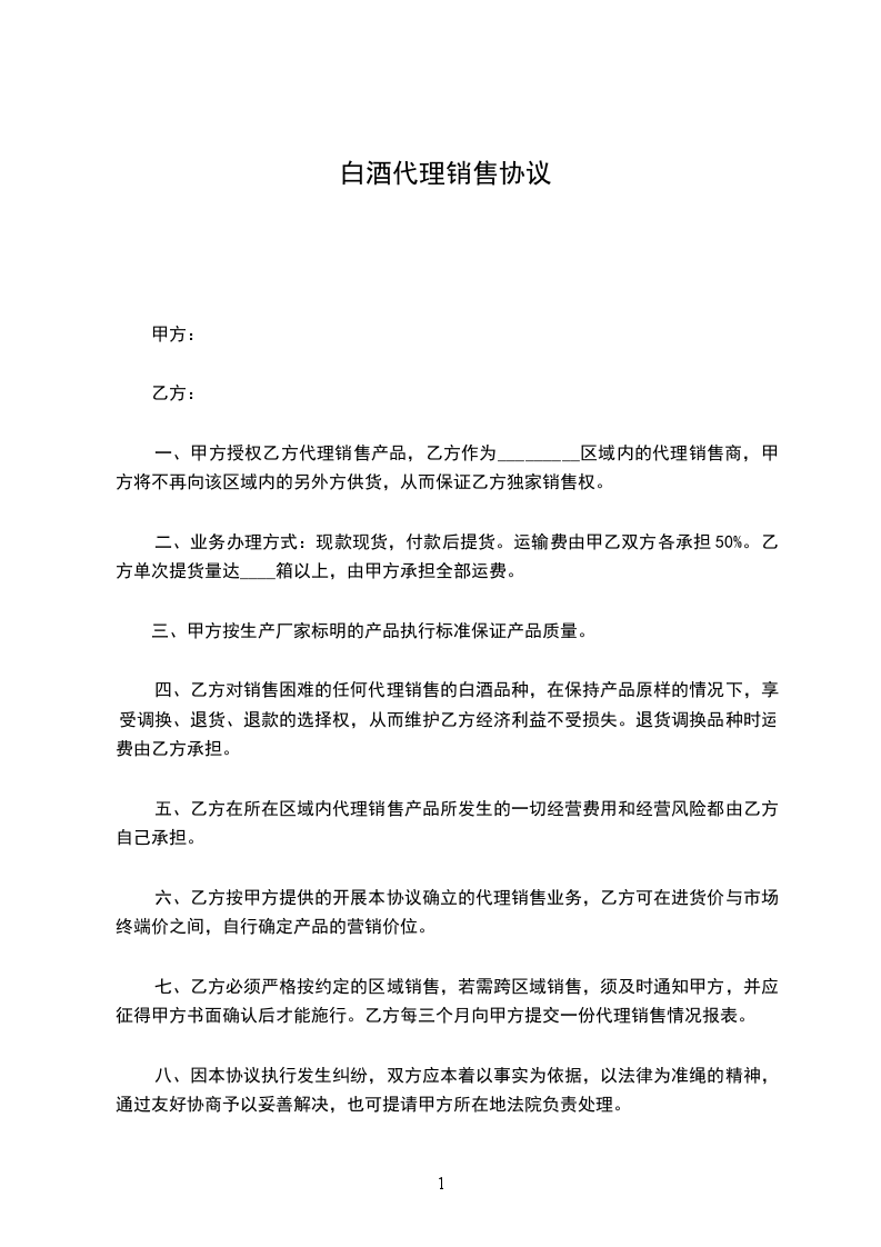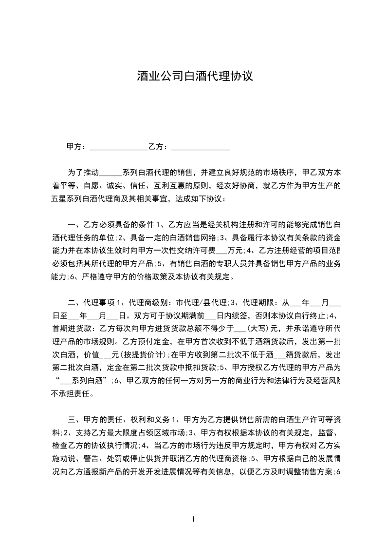 一、乙方必须具备的条件1、乙方应当是经关机构注册和许可的能够完成销售白酒代理任务的单位;2、具备一定的白酒销售网络;3、具备履行本协议有关条款的资金能力并在本协议生效时向甲方一次性交纳许可费___万元;4、乙方注册经营的项目范围必须包括其所代理的甲方产品;5、有销售白酒的专职人员并具备销售甲方产品的业务能力;6、严格遵守甲方的价格政策及本协议有关规定。