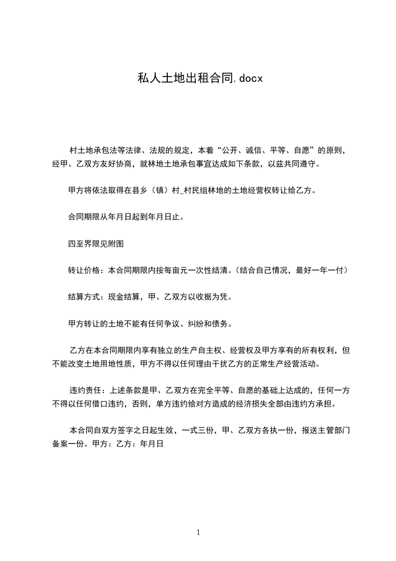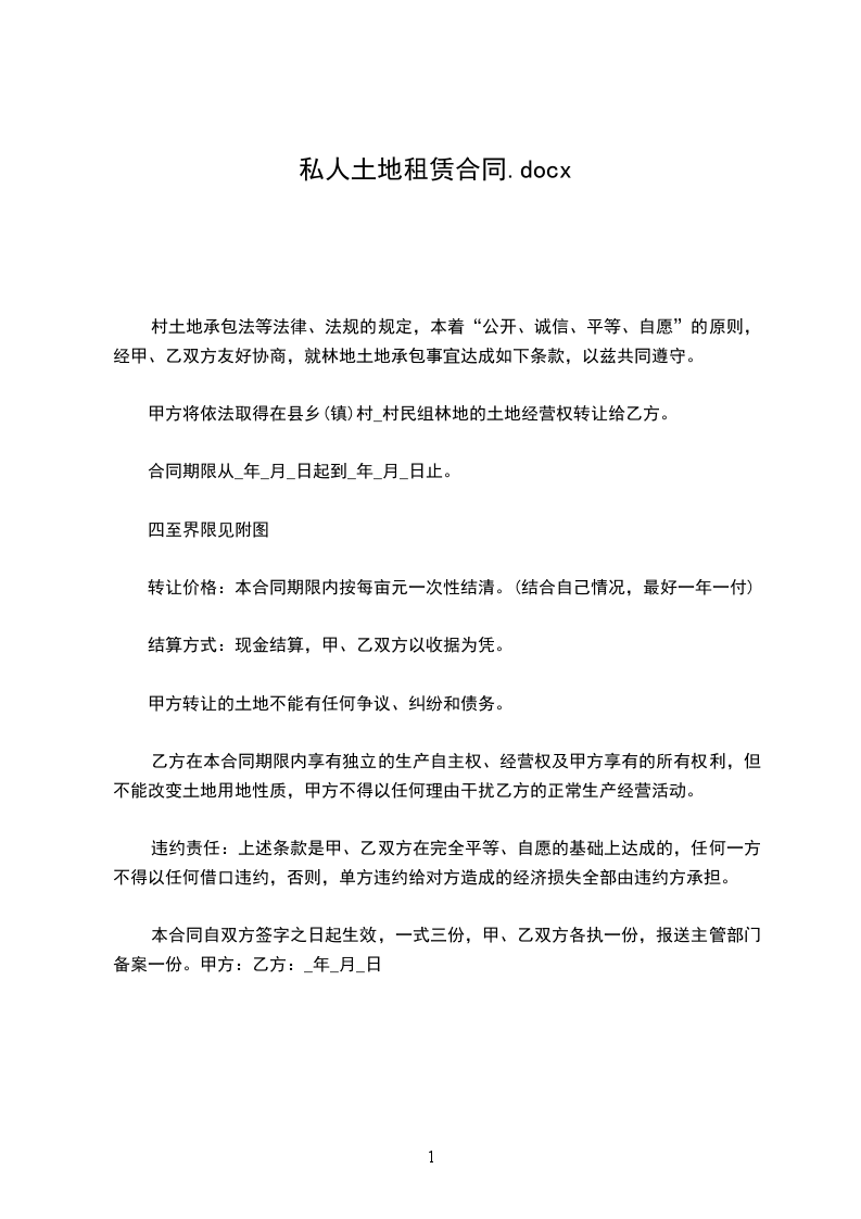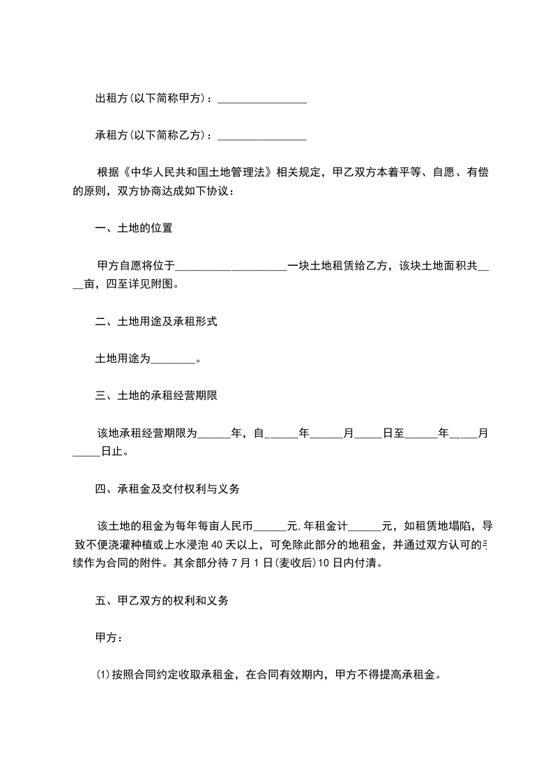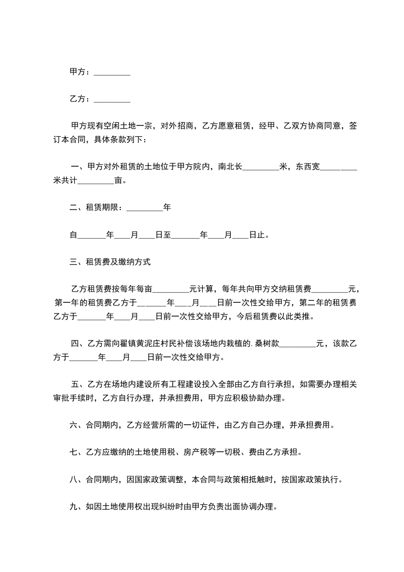 甲方自愿将位于____________________一块土地租赁给乙方,该块土地面积共____亩,四至详见附图。