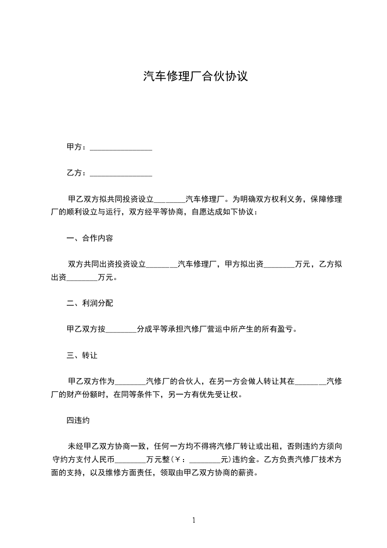 未经甲乙双方协商一致,任何一方均不得将汽修厂转让或出租,否则违约方须向守约方支付人民币________万元整(¥:________元)违约金。乙方负责汽修厂技术方面的支持,以及维修方面责任,领取由甲乙双方协商的薪资。