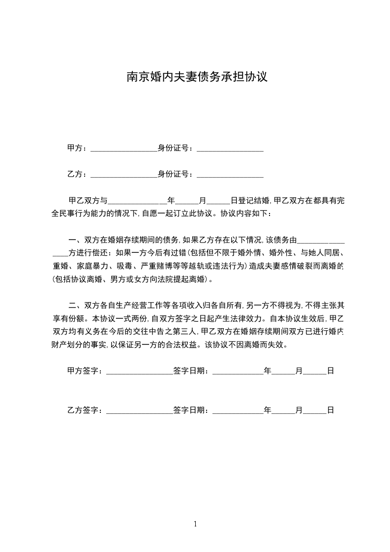 一、双方在婚姻存续期间的债务,如果乙方存在以下情况,该债务由________________方进行偿还:如果一方今后有过错(包括但不限于婚外情、婚外性、与她人同居、重婚、家庭暴力、吸毒、严重赌博等等越轨或违法行为)造成夫妻感情破裂而离婚的(包括协议离婚、男方或女方向法院提起离婚)。