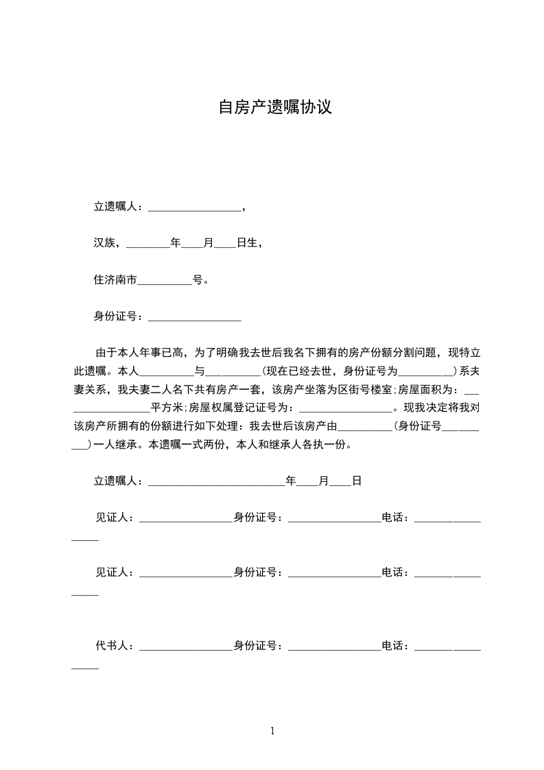 由于本人年事已高,为了明确我去世后我名下拥有的房产份额分割问题,现特立此遗嘱。本人__________与__________(现在已经去世,身份证号为__________)系夫妻关系,我夫妻二人名下共有房产一套,该房产坐落为区街号楼室;房屋面积为:_________________平方米;房屋权属登记证号为:_________________。现我决定将我对该房产所拥有的份额进行如下处理:我去世后该房产由__________(身份证号__________)一人继承。本遗嘱一式两份,本人和继承人各执一份。