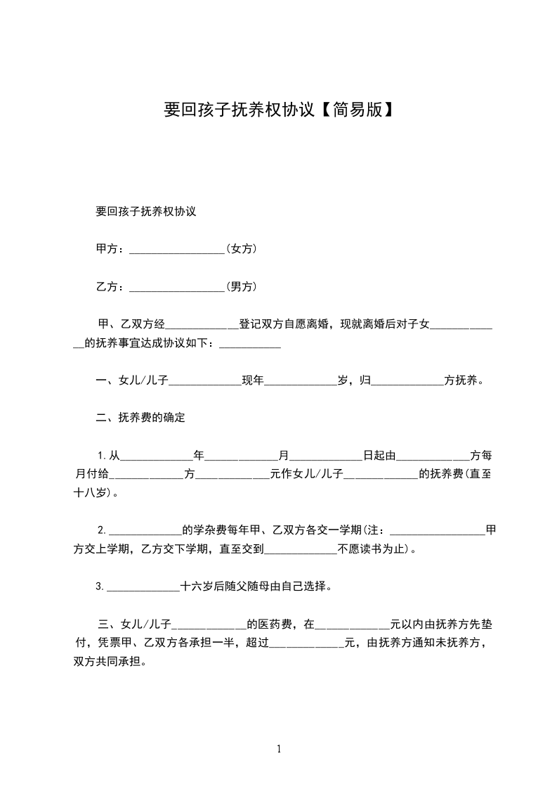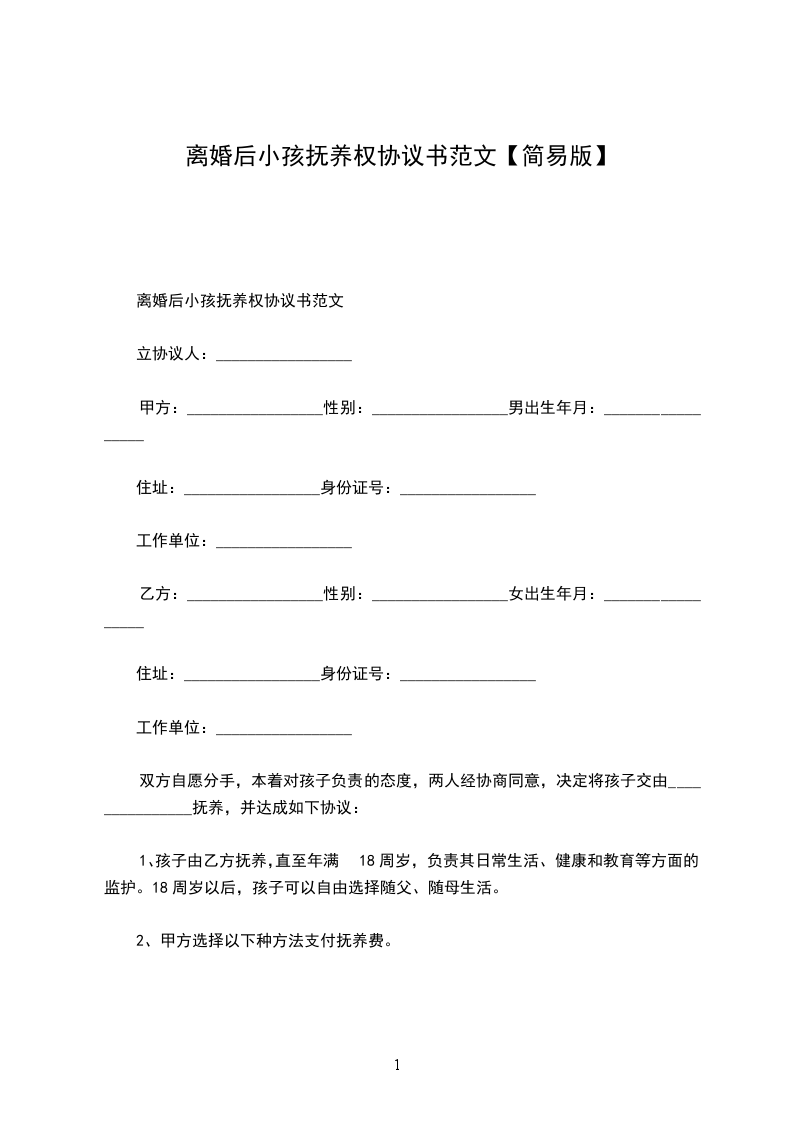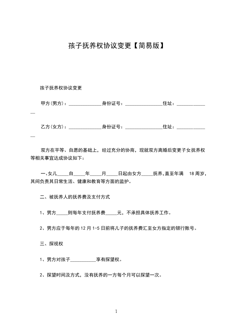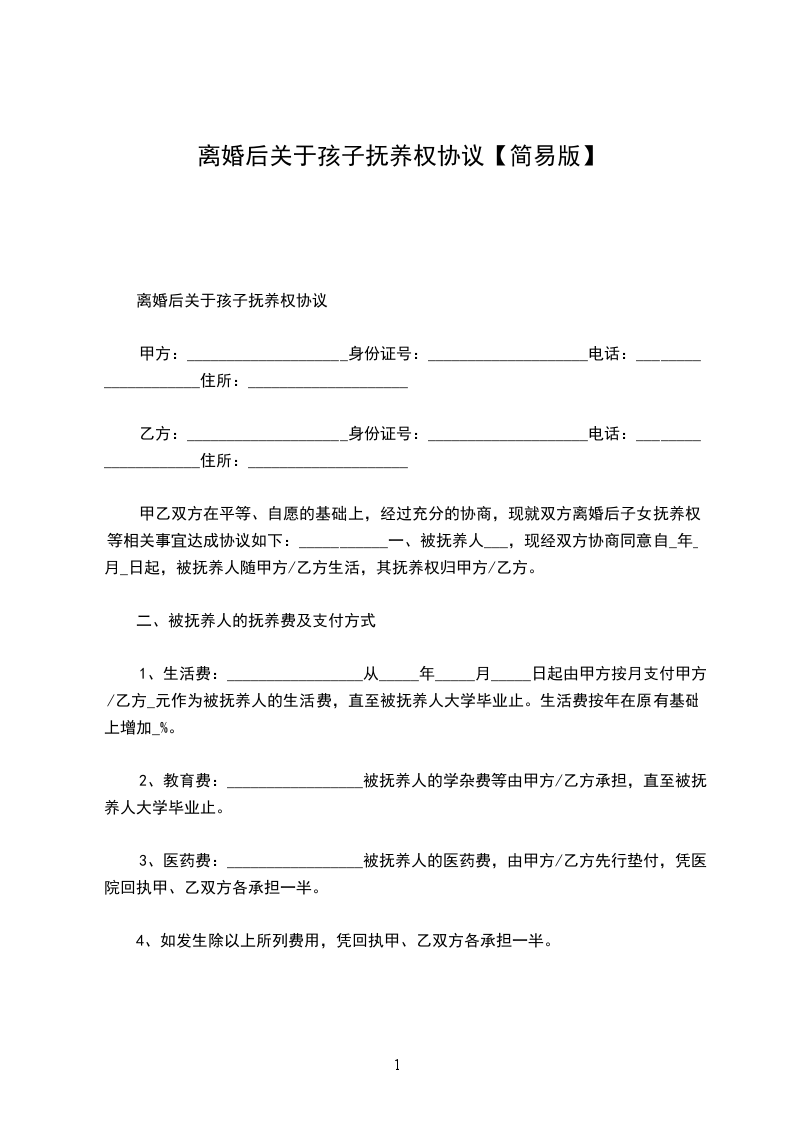 甲乙双方在平等、自愿的基础上,经过充分的协商,现就双方离婚后子女抚养权等相关事宜达成协议如下:___________一、被抚养人___,现经双方协商同意自_年_月_日起,被抚养人随甲方/乙方生活,其抚养权归甲方/乙方。