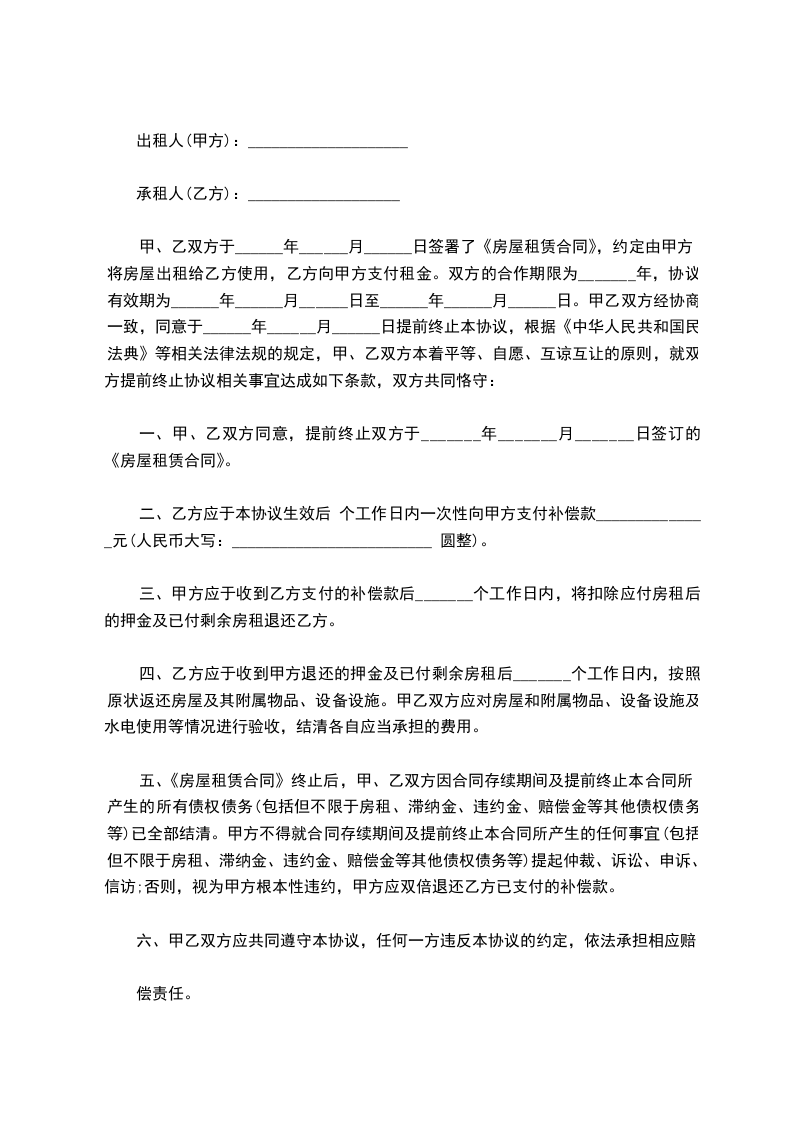 甲乙双方于____年__月__日签订了《房屋租赁合同》,约定由甲方将位于___市___区___路___号的房屋出租给乙方使用。现甲乙双方经协商一致,同意于____年__月__日提前终止《房屋租赁合同》,根据《民法典》等相关法律法规的规定,甲乙双方本着平等、自愿、互谅互让的原则,就双方提前终止《房屋租赁合同》协议相关事宜达成如下条款: