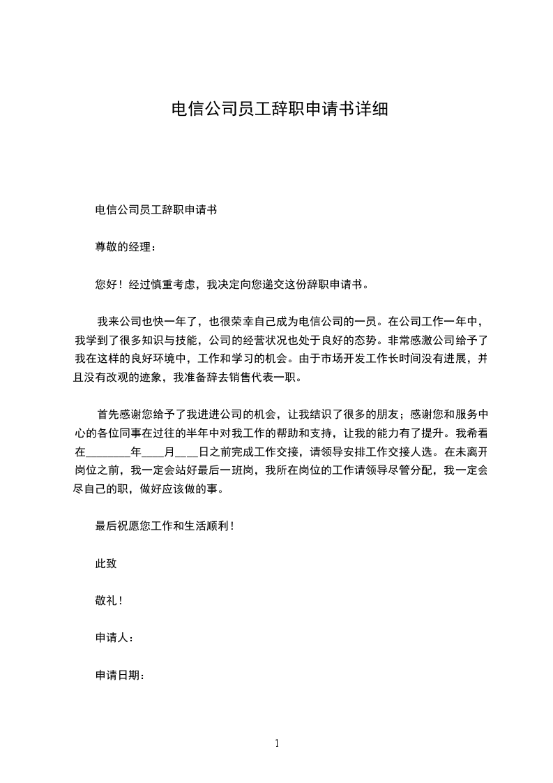 电信公司员工辞职申请书