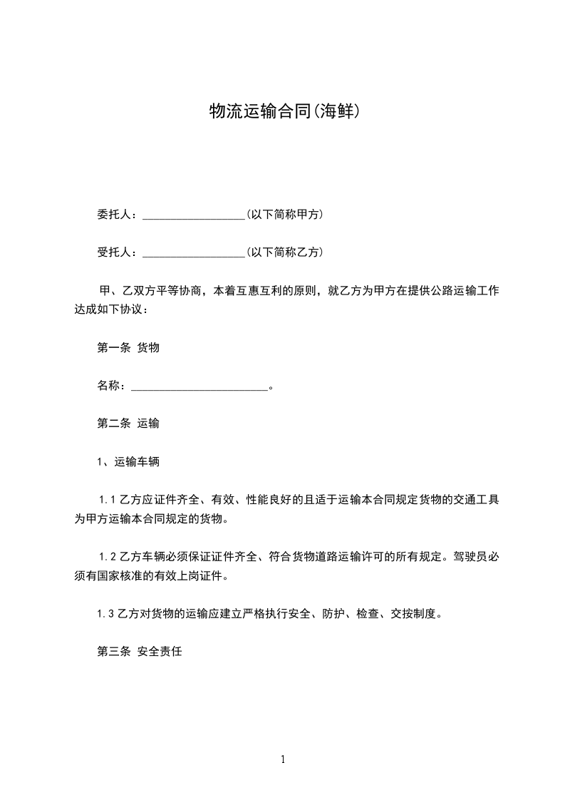 1.1乙方应证件齐全、有效、性能良好的且适于运输本合同规定货物的交通工具为甲方运输本合同规定的货物。