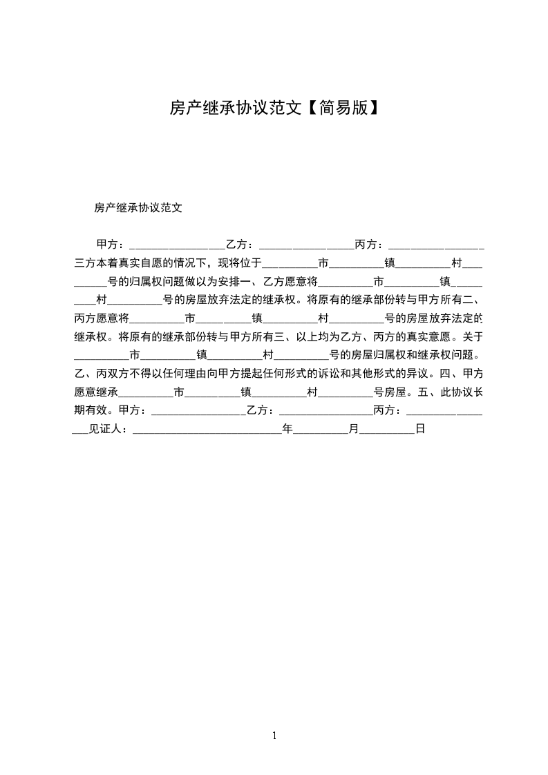 甲方:_________________乙方:_________________丙方:_________________三方本着真实自愿的情况下,现将位于__________市__________镇__________村__________号的归属权问题做以为安排一、乙方愿意将__________市__________镇__________村__________号的房屋放弃法定的继承权。将原有的继承部份转与甲方所有二、丙方愿意将__________市__________镇__________村__________号的房屋放弃法定的继承权。将原有的继承部份转与甲方所有三、以上均为乙方、丙方的真实意愿。关于__________市__________镇__________村__________号的房屋归属权和继承权问题。乙、丙双方不得以任何理由向甲方提起任何形式的诉讼和其他形式的异议。四、甲方愿意继承__________市__________镇__________村__________号房屋。五、此协议长期有效。甲方:_________________乙方:_________________丙方:_________________见证人:___________________________年__________月__________日