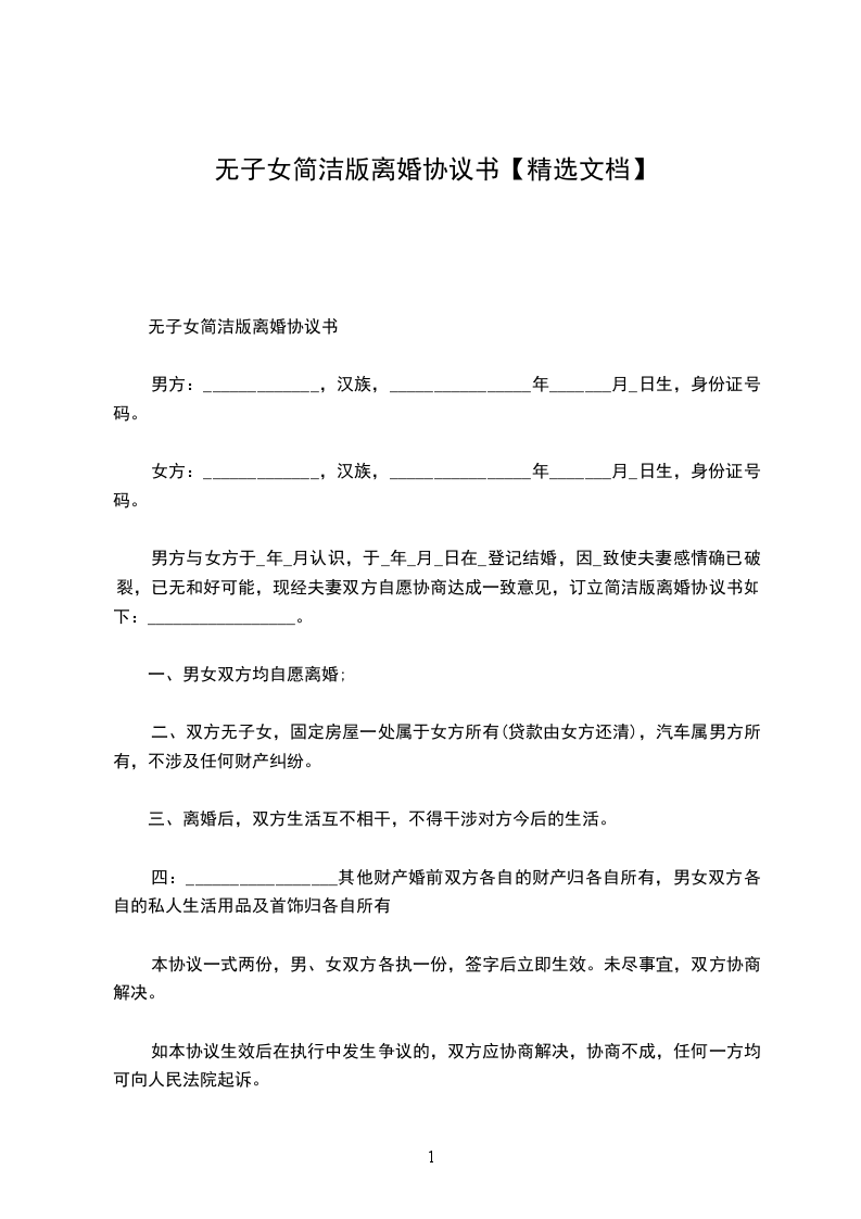 无子女简洁版离婚协议书