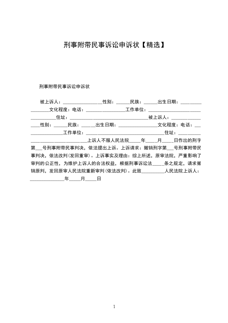 被上诉人:_________________性别:______民族:______出生日期:_________________文化程度:电话:_________________工作单位:__________________________________住址:__________________________________被上诉人:_________________性别:______民族:______出生日期:_________________文化程度:电话:_________________工作单位:__________________________________住址:__________________________________上诉人不服人民法院_____年_____月_____日作出的刑字第___号刑事附带民事判决,依法提出上诉。上诉请求:撤销刑字第___号刑事附带民事判决,依法改判(发回重审)。上诉事实及理由:综上所述,原审法院,严重影响了审判的公正性,为维护上诉人的合法权益,根据刑事诉讼法_____条之规定,请求撤销原判,发回原审人民法院重新审判(依法改判)。此致__________人民法院上诉人:_______________年_____月_____日