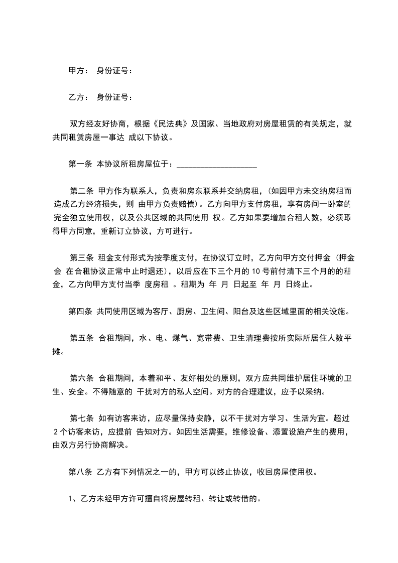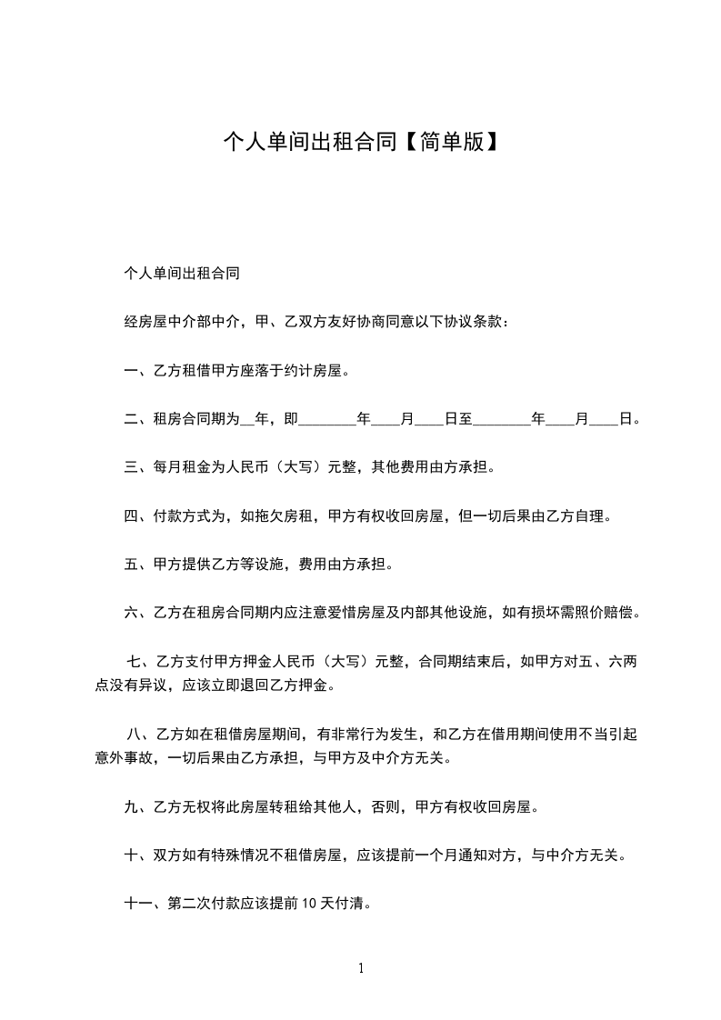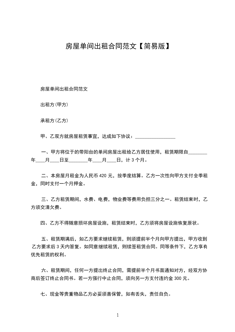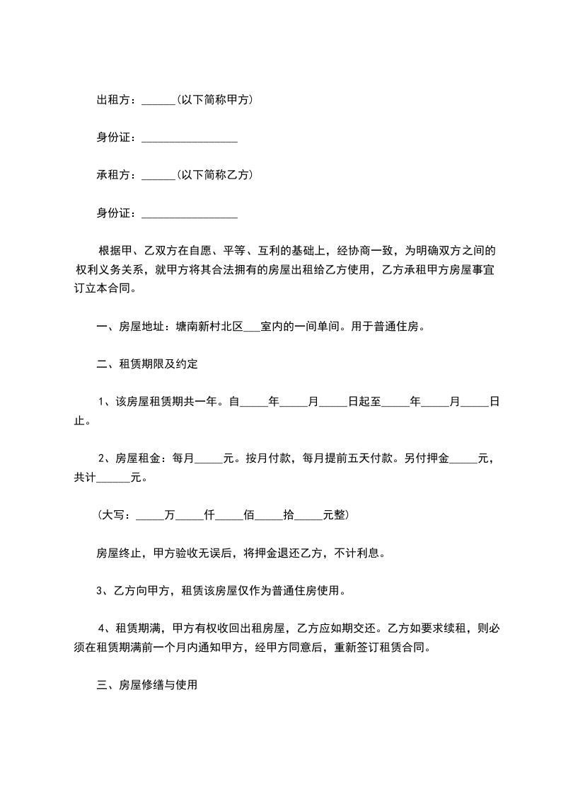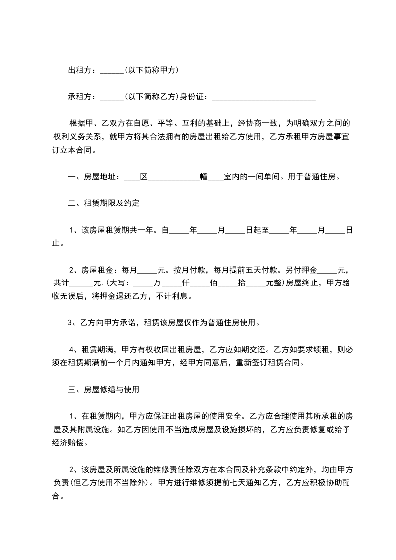 租房合同单间出租协议